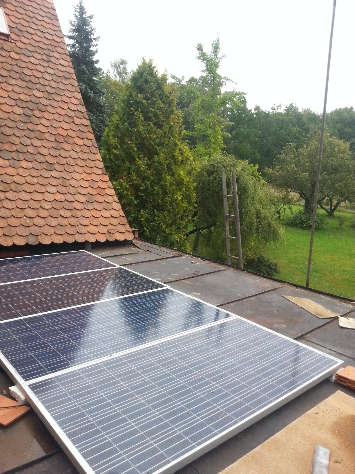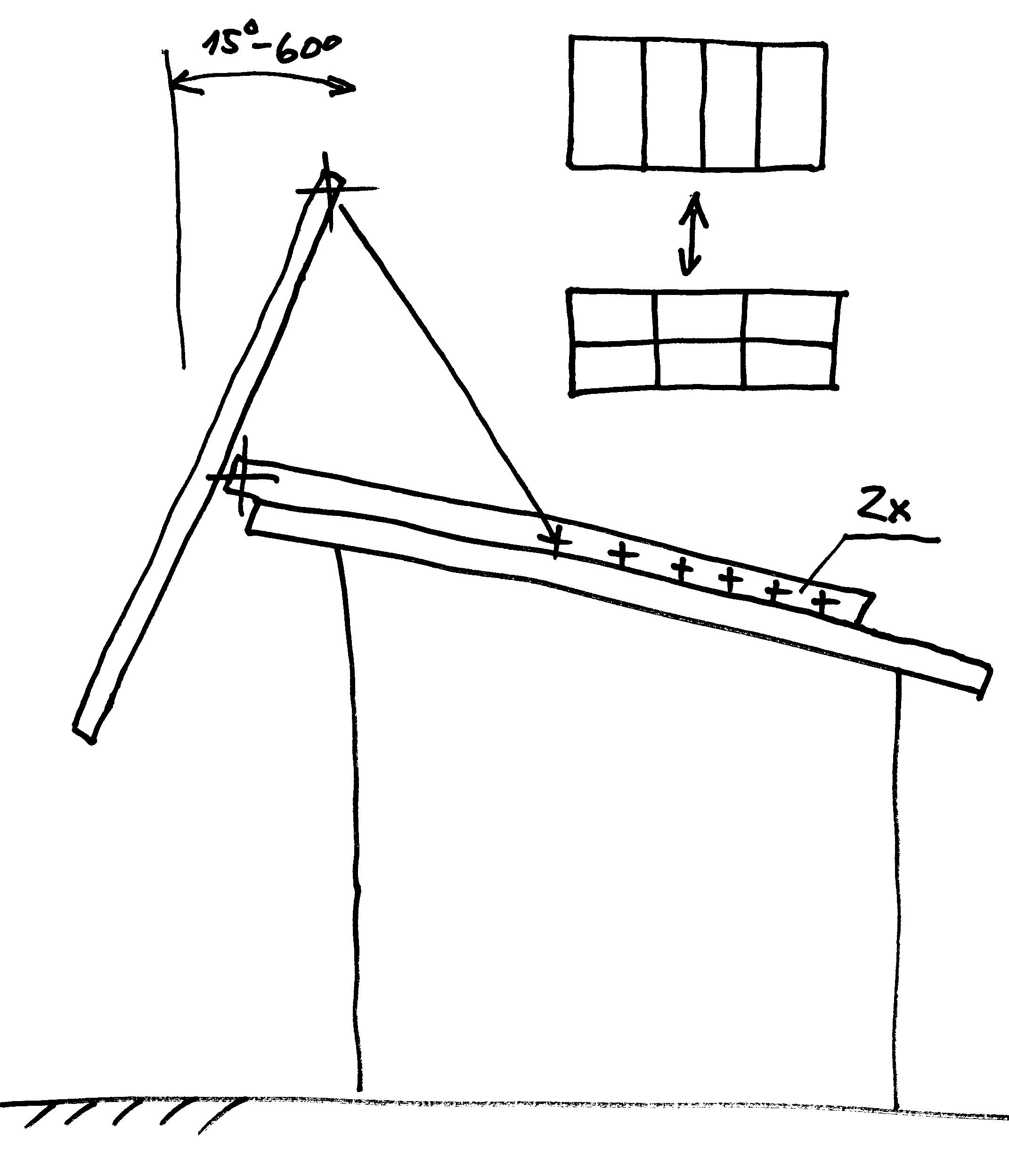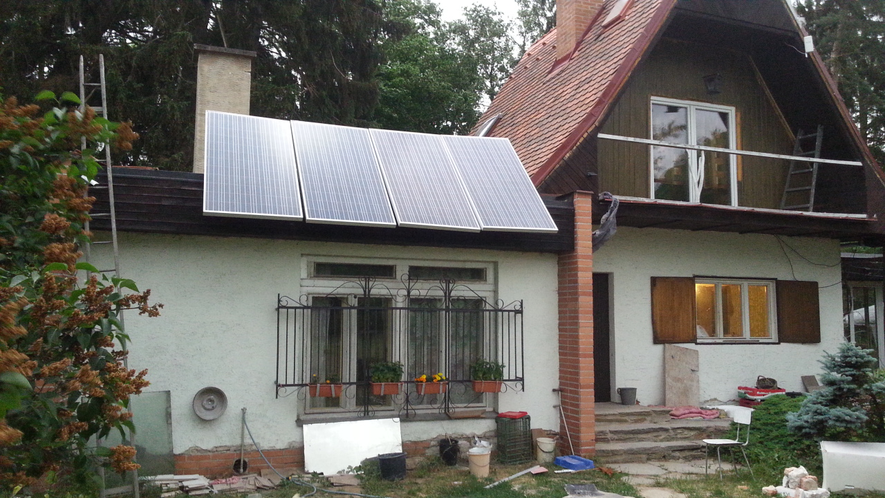 Panely sú zrejme voľne položené na streche, to na leto vyhovuje s výhradou. Veľmi rýchlo sa blíži zima a panely musíte nevyhnutne stavať kolmejšie. Doporučujem upevniť ich v uhle max. 25 stupňov od zvislice, vtedy sneh samotiažou padá dolu sám. Pod panelom musí byť priestor cca 30 cm, ktorý budete čistiť podľa potreby. Druhá možnosť je dať ich tesne na hranu strechy tak, aby voda stekala na strechu, ale aby sneh spadol dolu a na hrane strechy sa nezachytil. V každom prípade panely NALEŽATO. Veľa možností na Vašich dvoch strechách nemáte, ale treba sa tým urýchlene zapodievať, slnko klesá rýchlo k južnému obzoru...... Ak Vám to nevydá, nejaký panel môžete dať aj zvislo niekde na fasádu, veľa sa tým neskazí.