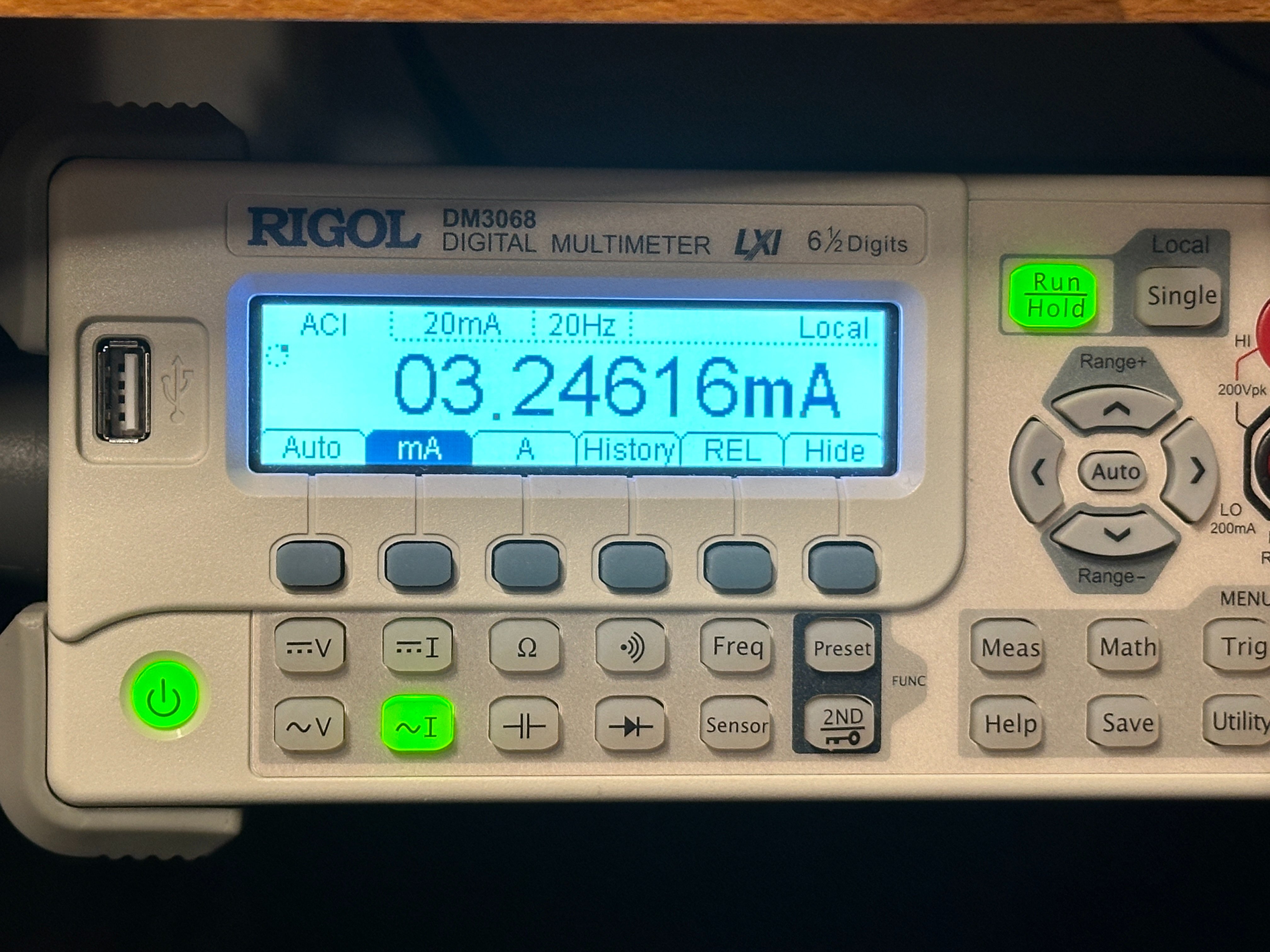 Při měření proudu předpokládám, že měl michald multimetr s rozsahem AC v mA zapojený v sérii se vstupem měniče pro CT a pak by k ovlivnění měření CT vstupu měničem nemělo s připojeným multimetrem docházet. Na obrázku je multimetr RIGOL DM3068, který měří AC proud (TRMS) dle mého názoru daleko přesněji než samotný měnič. Dle informace z diskuse viz tento odkaz o interním bočníku pro měření v rozsahu AC proudu do 20mA je dle datasheetu odpor bočníku 1 ohm. V té diskusi je zmínka, že naměřil o něco více (3,3 ohmu), ale jak je tam zmíněno to je způsobeno tím, že je v sérii s bočníkem i vnitřní zapojení a pojistka. Pokud by to připojil nesprávně paralelně jako při měření napětí tak to by mohla být příčina toho, že by připojení multimetru ovlivňovalo to co by ukazoval měnič, ale takovou chybu snad neudělal.