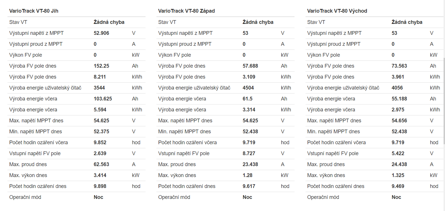 Ani nemluv 25 dnů pod poloviční potřebou.Měl bych na Tebe dotaz s výkony jednotlivých polí ve stejném čase V/J/Z.Když je tedy ideální den a osvit tak při přímém směru na V pole dávají ty další dvě J/Z kolik? A postupně jak jde slunce na další,stačí mě info o kolmém a rovnoměrně rozděleném úhlu na strany?Vím že upevnění panelů máš vůči elevaci slunce špatně,hold dům se na to nestavěl,ale i tak budu rád za info,díky.