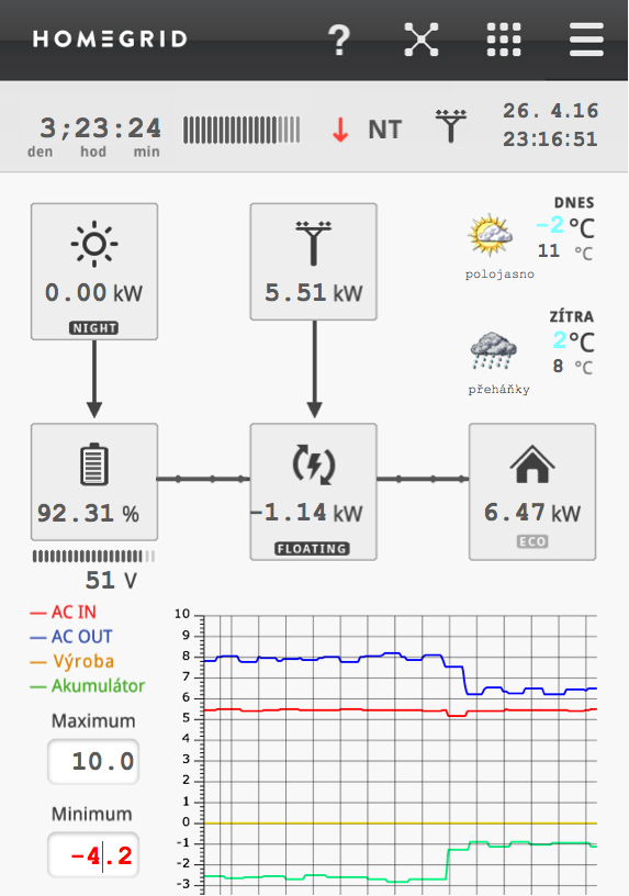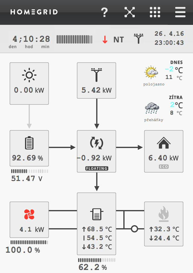 Doporučoval bych využít nadřazené PLC, jehož programy budete moci v průběhu času upravovat dle potřeby. Důležité je aby byl použitý hw schopný reagovat na různé stavy a aktuální podmínky. V našem systému již využíváme predikční metody a můžeme tedy lépe a předem ovlivnit jak spotřebu tak akumulaci (do baterek a do vody). Systém ovládáme přes mobil, tablet nebo PC. Jak se časem v domě objevují nové, dříve nepředvídané návaznosti využívání energie postupně je díky nadřazenému PLC můžeme přizpůsobovat aktuálním požadavkům. Uřídit FV systém s připojením k síti tak aby fungoval v souladu s počasím není ve finále až tak jednoduché a je myslím výhodou, když se systém dá s průběhem času postupně přizpůsobovat. Pro inspiraci přikládám příklad aktuálního online stavu z našeho systému.