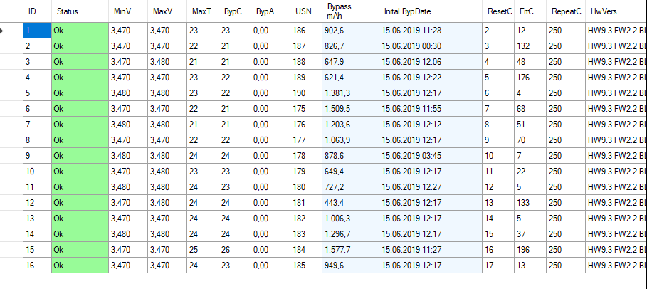 Co maji za sebou by asi vedel Ota, kapacity kolem 170-160Ah, druha varka baterek byla uz trosku obcas nafoukla, je zapojeno 2P16S aby se trosku zlepsil vnitrni odpor. Kapacitu jsem ted nemeril, cekal jsem ze to zkusim batriem, az bude teplo a jistota ze je pres den dobiju zpet.