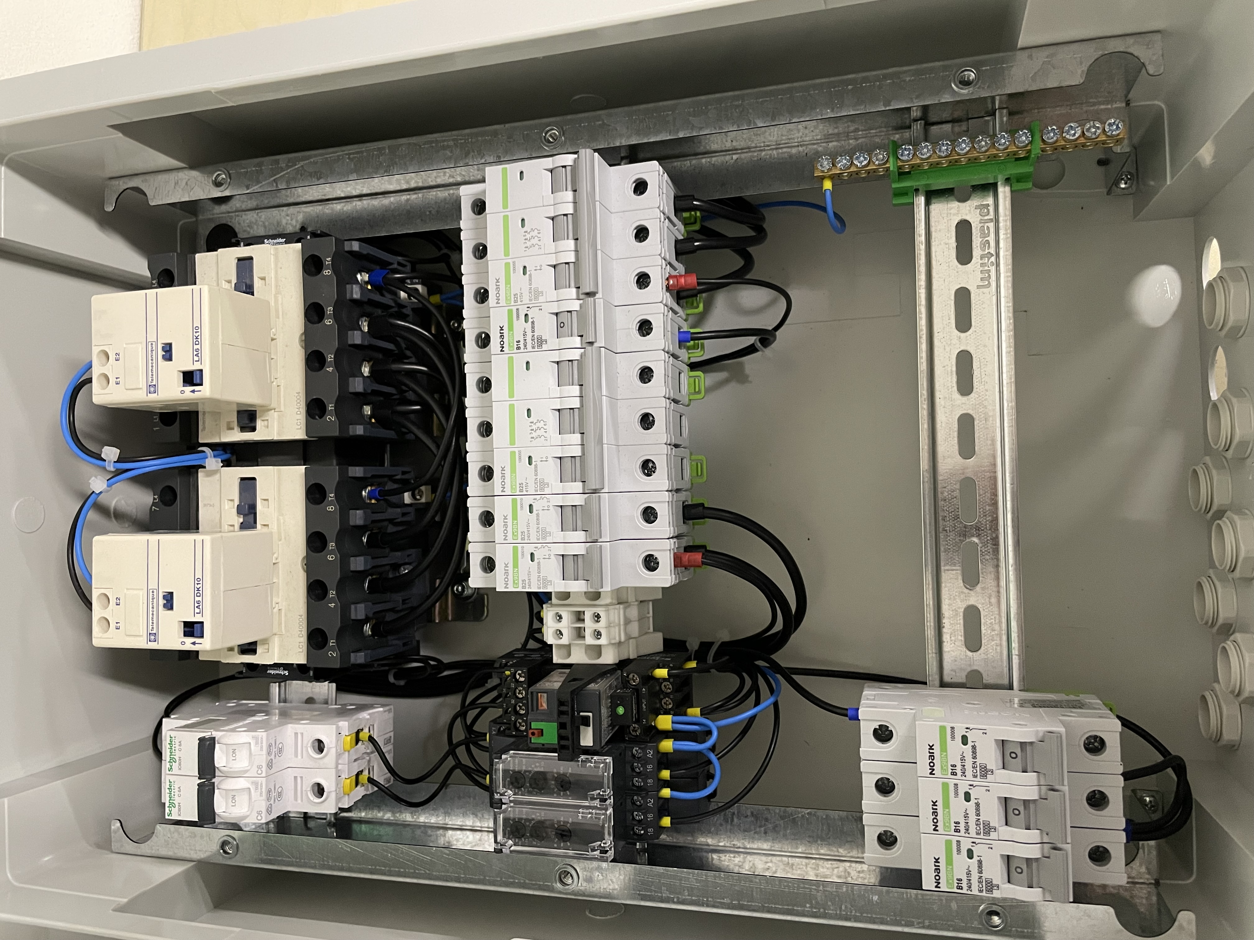 Moje řešení má mírně poddimenzované stykače (aby se to pěkně vešlo do rozvaděče přičemž moje běžné zatížení fází je do 10A). Celé to může vypadat například takto (samozřejmě bez zakrytování, aby to bylo lépe vidět)