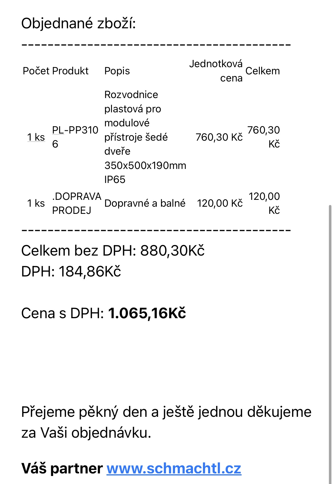 Díky. Tak na schmachtl vidím cenu 3.150,- za ten tvůj rozvaděč. Takže buď máš speciální ceny, nebo kluci pěkně podražili.