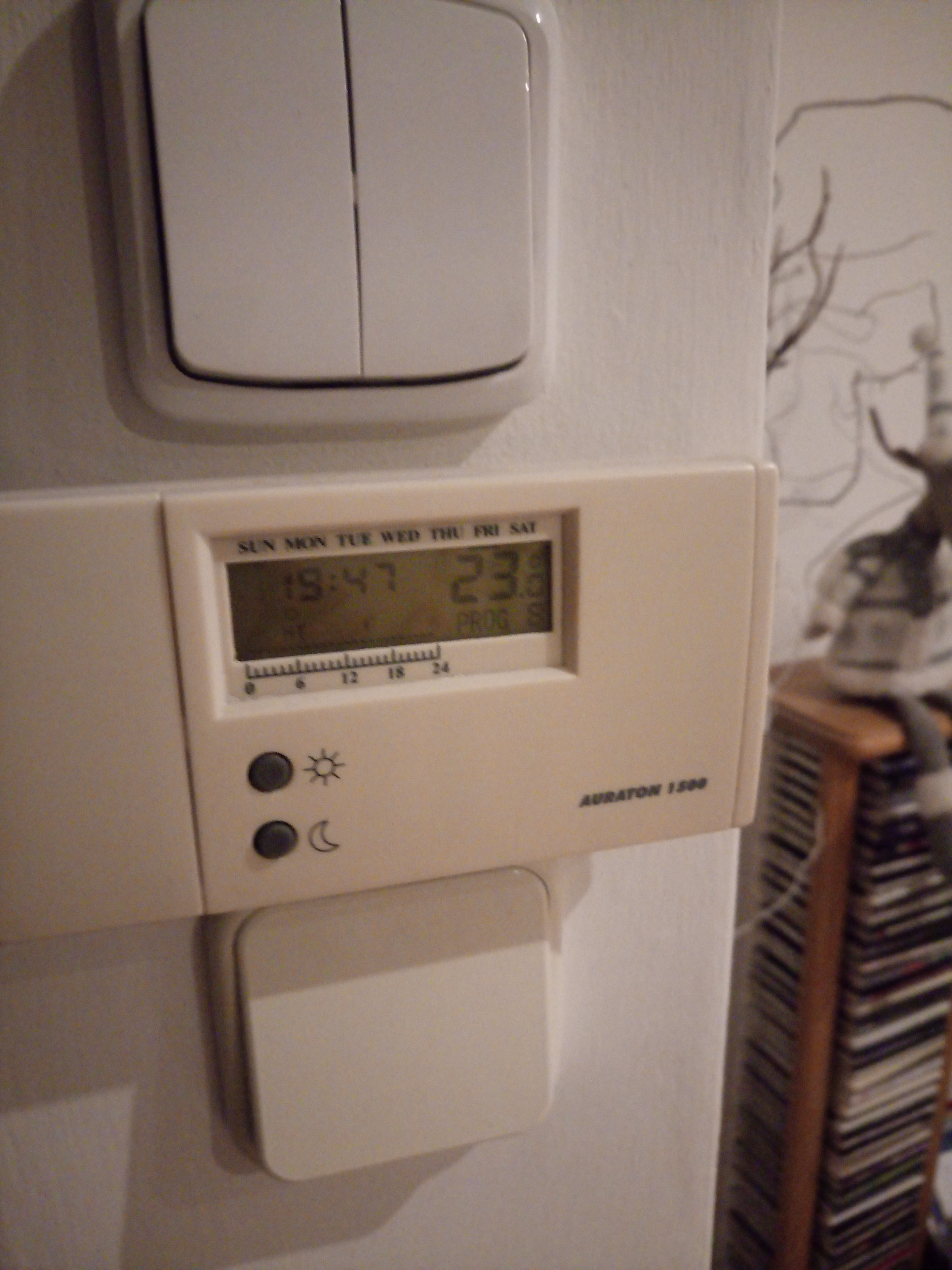 Termostat jen pouští servopohon na ventilu AN samotížného rozvodu,takže 23°C je strop doběhu 80°C vody v radiátorech,spíná 21.5°C na 22.5°C.Já jsem ten trenýrkový odchov v domě spíš