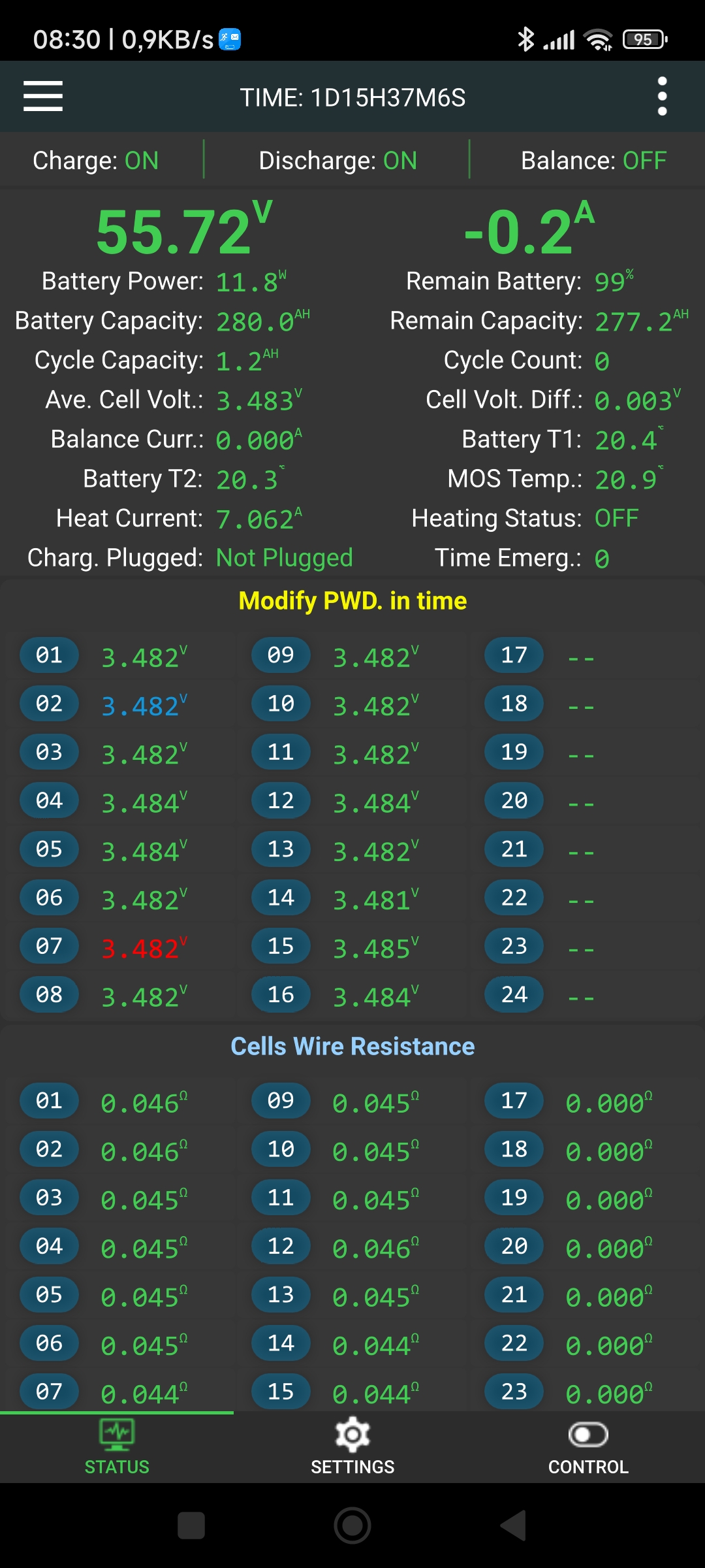 16 x spojeno do série, osazeno JKBMS, a připojeno ke střídači. Prvně jsem nabíjel na 20A, a 53.00V ke konci jsem napětí postupně zvyšoval, nyní mám měřené dle BMS 55,73V, průměrné napětí na článku je 3,483 a co hlavní napětí rozdílu buněk je 0,003V.