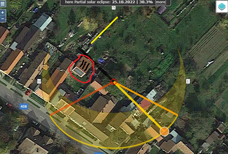 1. buď na druhou stranu střechy přístavku, tři řady panelů se sklonem 30°na JV (černá čára 3x) Samotná střecha má sklon 25°na SV, tak musí být podpěry trojúhelník AL 40/40/3 právě na JV. Jediné co mi zatím dělá čáru přes plán, je soused na východě, má tam mohutný ořešák, výška asi 9m. Na obrázku je ale projekce jak bude dělat stín 15.11 v 8.30, to je ta černá čára ze středu malého červeného kolečka.