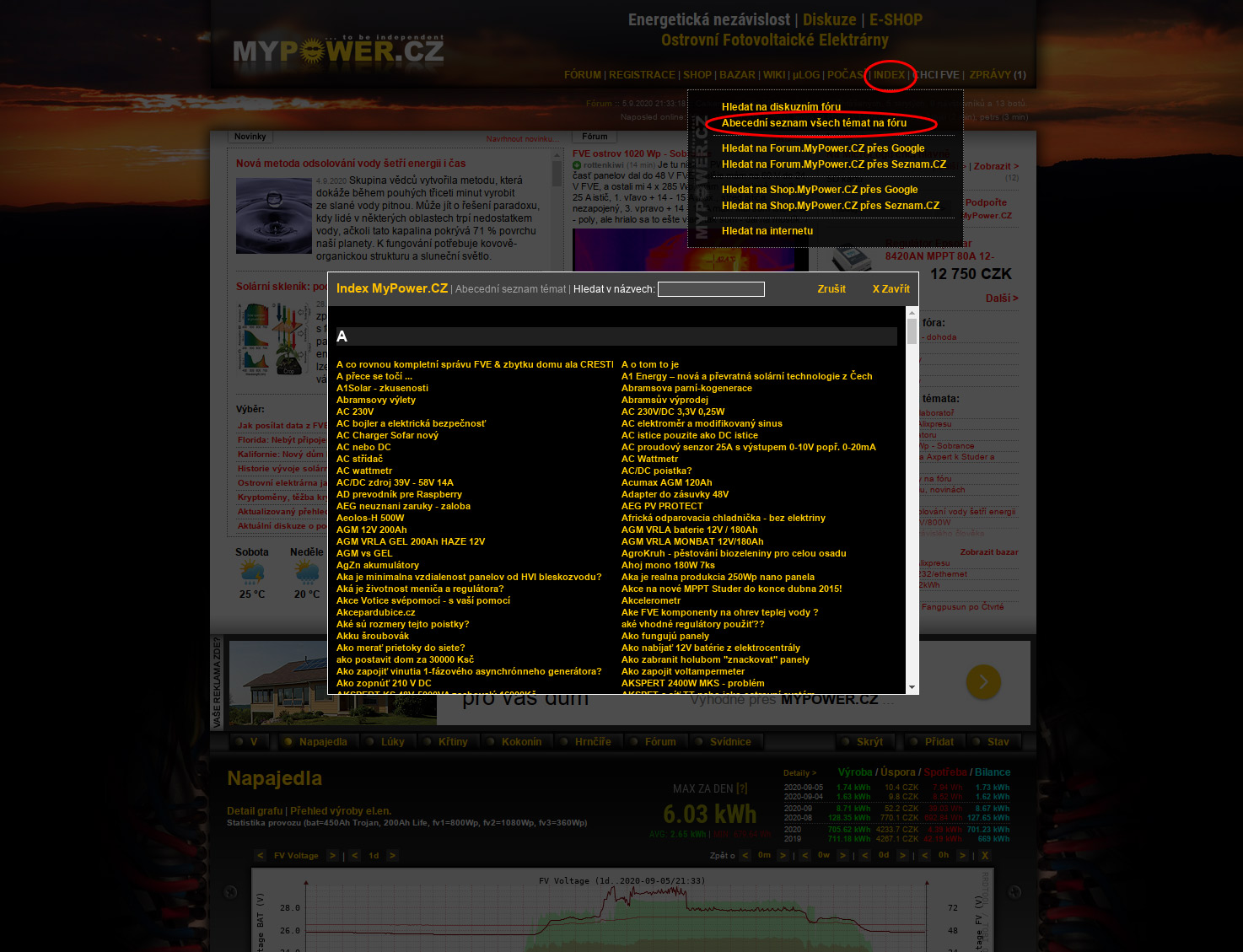 Dobré odpoledne ve spolek pánové. Po hodně dlouhé době se také připojím do diskuze. Že jsem nechodím zase tak často, neznamená že občas nenahlédnu. Jen mám třeaba raději kutění. A řídím se heslem když nevíš co říci, mlč. Jestli tedy nechcete, stálé dotazy od nováčků, navrhnul bych celkem jednoduchou věc a tu nejak nemohu na jednom místě najít (nebo jsem ji sakra přehlédl). Jistě bych určítě nejčastější schémata zapojení s běžně používanými komponenty našel, ále je to na prolezení kupy zbytečného balastu a dotazů. Stačí jednu záložku nevím, nejčastější dotazy, praktické schémata,bězně používaná zapojení... příspěvek jen po schválení adminem a třeba dát možnost nahlášení Odpad/chyba apod.. a umístění někam, hned z kraje fóra, tak aby hned praštila do očí. Sem nacpat DVOUPÓLOVÁ schémata zapojení nejčastěji používaných regulátorů, měničů, přepínačů sítí-mechanických,elektronických na 12V-24V-48V-atd. Neřešit žádný individuální špeky, jen obecná,běžná schémata. Obrázek za tisíc slov. Prostě manuál pro nováčka, co by si chtěl navrhnout elektrárnu a potřebuje zjistit chování,zapojení běžně používaných komponent. Zjištuje co vlastně tepve chce a jak na to šli ostatní. Důvod proč je zrovna tento regulátor, měnič, panel, způsob zapojení tak oblíben. Já sám třeba plavu v měničích napětí. Jako chápu ongrid/ofgrid ale nemám přehled v tom jak se který z nejčastěji používaných měničů chová. Např. přepínání síť/měnič, je plynulé nebo ala UPS přes relé. Tvar výstupních signálů co z toho leze....no tohle tady dohledat je na hodiny a tolik času nemám. Ale hodit tyhle hutný formace do jedné složky ve fóru, s podsložkami např. jen se schématy s měniči pro konkrétní typ a dál to zbytečně nevětvit. Líbal bych dotyčným autorům ruce. Další složky např. pro solární regulátory a opět jen schémata s konkrétními typy. Podložku s bězně zapojenými FV panely atd.. Prostě bez zbytečného okecávání schéma a popis chování. Hledám ten a ten typ regulátoru/měniče.. kouknu do schémat. Tak ať to nestojí moc času autora ani admina. JPEG obrázek se schématem a pod ním nějaký popis s komentem autora, nic víc. Ať jen nekecám, sám bych mohl v případě zájmu přidat schéma rozvaděče pro měnič EVT248-nic složitýho, jen běžně dostupné komponenty z elektra. Tak jak jsem ho vyřešil já. Jističe, elektroměr vypínač. Chytrý to (zatím) není, ale dal jsem si práci aby to aspoň trochu plnilo normy (teda aspoň v to doufám).