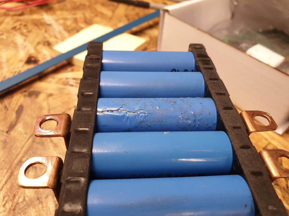 Připomenu že z takového LiIon článku se dere něco ven. Přiznám se, toto je jediný kus z 3360 zapojených a nějakých skoro 10000 co mi prošli rukama. Od té doby co jsem to zjistil už uplynuly možná dva roky. Je vidět, že se přehrál. A je vidět že tentokráte sebou nevzal žádný okolní. Dneska vypadá ještě o něco hůře, ale nemůžu najít aktuálnější fotku.