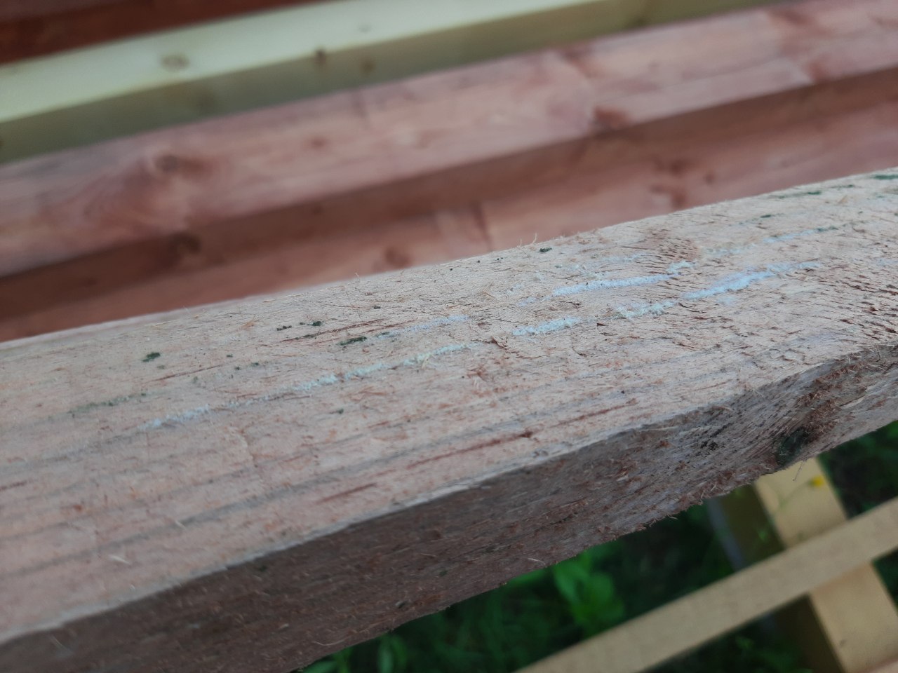Latě jsou levné položky a koupí se ve stavebninách další, ale to byl jen začátek. Pak byly na řadě trámy, část očernalá, jak by ležely přímo na betonu nebo něčem vlhkém. Na jednom byly u dvou rohů hran odštěpky cca 15 cm dlouhé a 4 cm hloubka. Na dalším to samé ale již v délce přes metr, bud odlupčivé trhliny nebo už nestačila šířka kmene. No a v jednom kvh hranolu u konce malý smolník. (Obyč trámy byly na krokve, kvh na pozednice) Tu lat s houbou a ten jeden trám jsem po nich chtěl vyměnit, tak mi přivezli nový. Mají vlastní auto, bylo to v době kdy celý týden pršelo a přijelo auto bez plachty. Můj trám byl obalený potravinářskou folií, ale lat a další dřevo pro další zákazníky jelo na dešti. Nic moc profesionálové. Trámy jsem sice bral impregnované, ale když jsem na té lati viděl houbu, raději jsem vše naimpregnoval ještě dodatečně další čtyři nátěry. Trámy jsem vyřezal, předvrtal díry, sám to vše vytahal na střechu a při posledním kontrolním měření před šroubováním vrutů zjistil, že to nějak nevychází. Blbouni poslali jiný rozměr trámů. Teoreticky viditelné na první pohled, ale jak jsem řešil více problémů a bylo tam dost kusů hnusného dřeva, tak mě nenapadlo to přeměřit. Navíc při výměně špatného trámu přivezli opět stejně špatný rozměr (v dodacím listu to bylo správně).