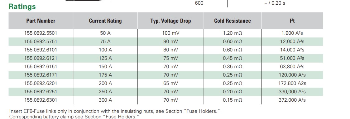 Ty CF8 pojistky jsou dobré v tom, že jsou levné, ale to nožovky taky a koupí se i v baumarktech. Pak je tam ale podstatný rozdíl, že zatímco i nejmenší nožovka NH000 má schopnost přerušit proud 120 kA, tak CF8 jen 2 kA a to si myslím, že drtivě převálcuje už jen jedna sada baterek.