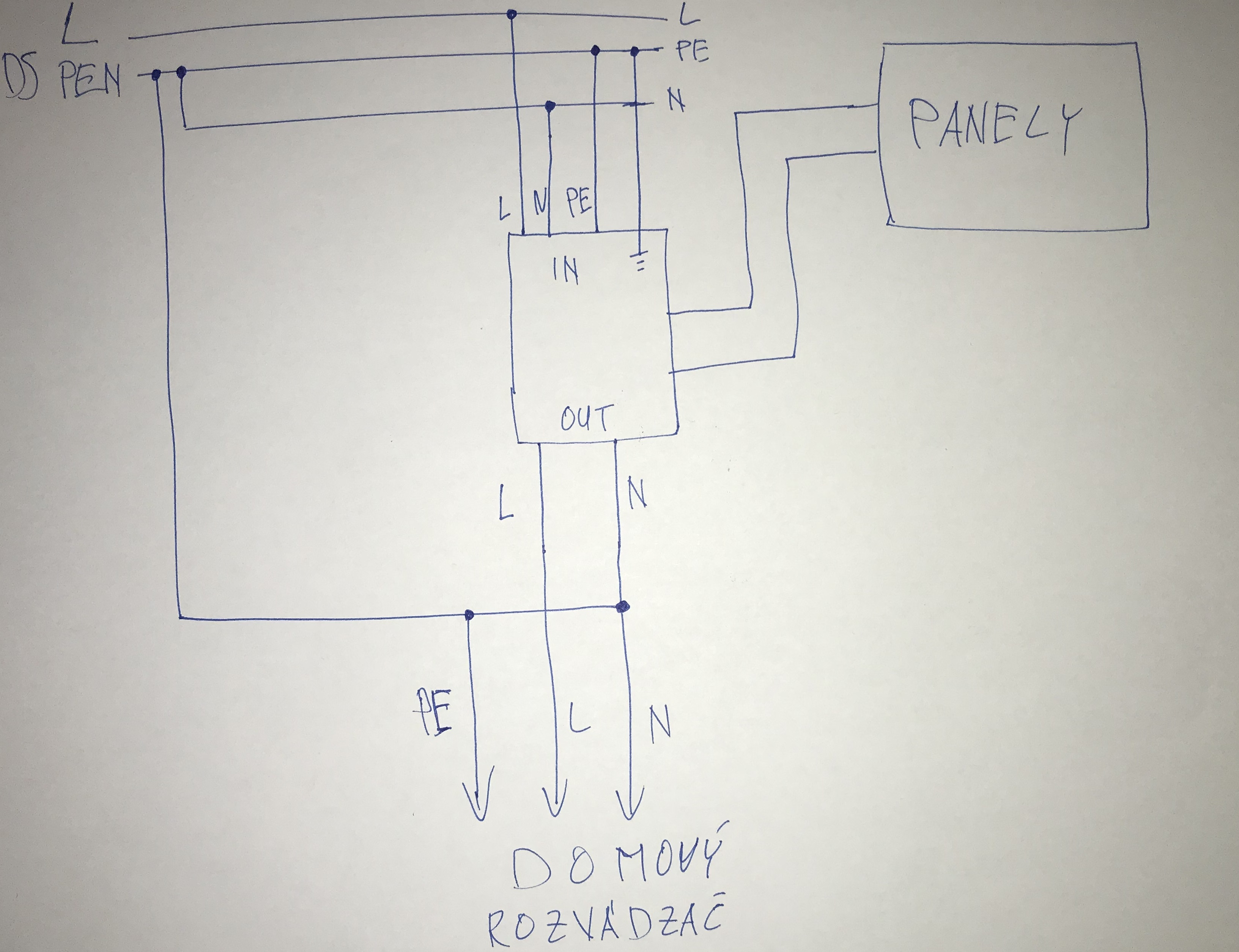 Toto by som spravil, ak by som mal celý dom na FVE, čo mať momentálne nebudem. Sporák a trúbu nechám zatiaľ na DS, to už by bolo moc na 5,6kW menič.Plazivec píše:Co chceš na tom kreslit? Místo dvoupólového ATS dáš 4pólové, jeden přívod bude z DS L1+L2+L3+PEN, druhý bude z axperta L+N, kde L axperta zapojíš na L1 a proklemuješ do L2 a L3. Bod rozdělení PEN uděláš až za výstupem z ATS.Diablo1st píše:Vedel by si mi nakresliť ako to máš zapojené? Nejako som to nepochopil (asi pokročilá hodina)