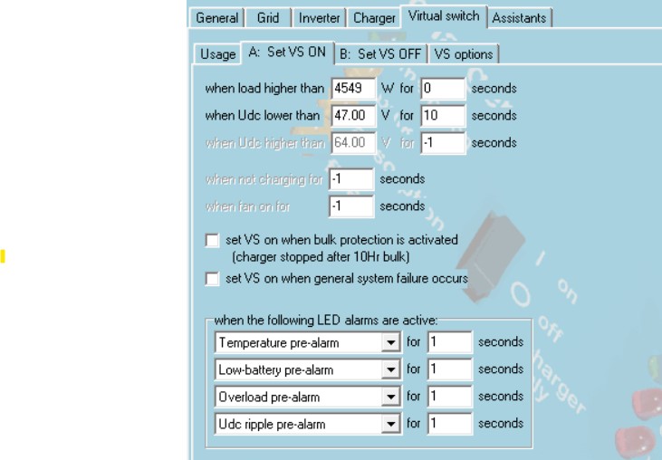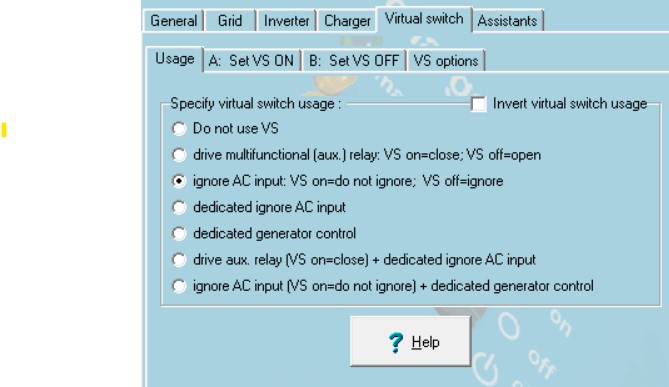 Pre ignore AC použi VS Dedicated ignore AC input. To na základné nastavenie stačí. Treba nastaviť horný aj dolný výkonový limit, rovnako aj dolné aj horné napätie.