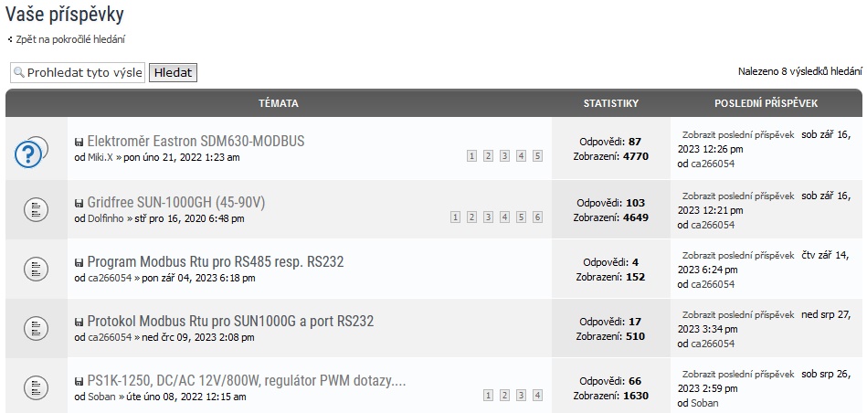 Zjistil jsem si, že to moje SDM120M už má v sobě ten protokol V2.4 .. ještě předtím jsem ale zjistil, že v tom Modbus28share mi zůstala chyba v převodu bytů na float, která se projevuje zvláště u menších fhodnot, takže místo node address 1.0 se čte 0.5 ..ca266054 píše:Začal jsem pracovat na verzi ModbusRtu11, která by měla umět číst jako verze 10 ale i zapisovat. A hned jsem narazil na problém, neboť jsem zjistil, že pro SDM120M už existují dvě verze protokolu .. první nemá žádnou verzi, takže si ji značím jako verzi Vx.y ale zřejmě by to mohla být ta verze V1.0 .. ten druhý protokol už je verze 2.4 aktuálně na stránkách EastronEurope .. a kdo ví, co ještě může být mezi těmito verzemi. No a nějak podobně to může být i u SDM630MCT a verze V1.7 nemusí být ta aktuální . Dám další dotaz na Eastron.