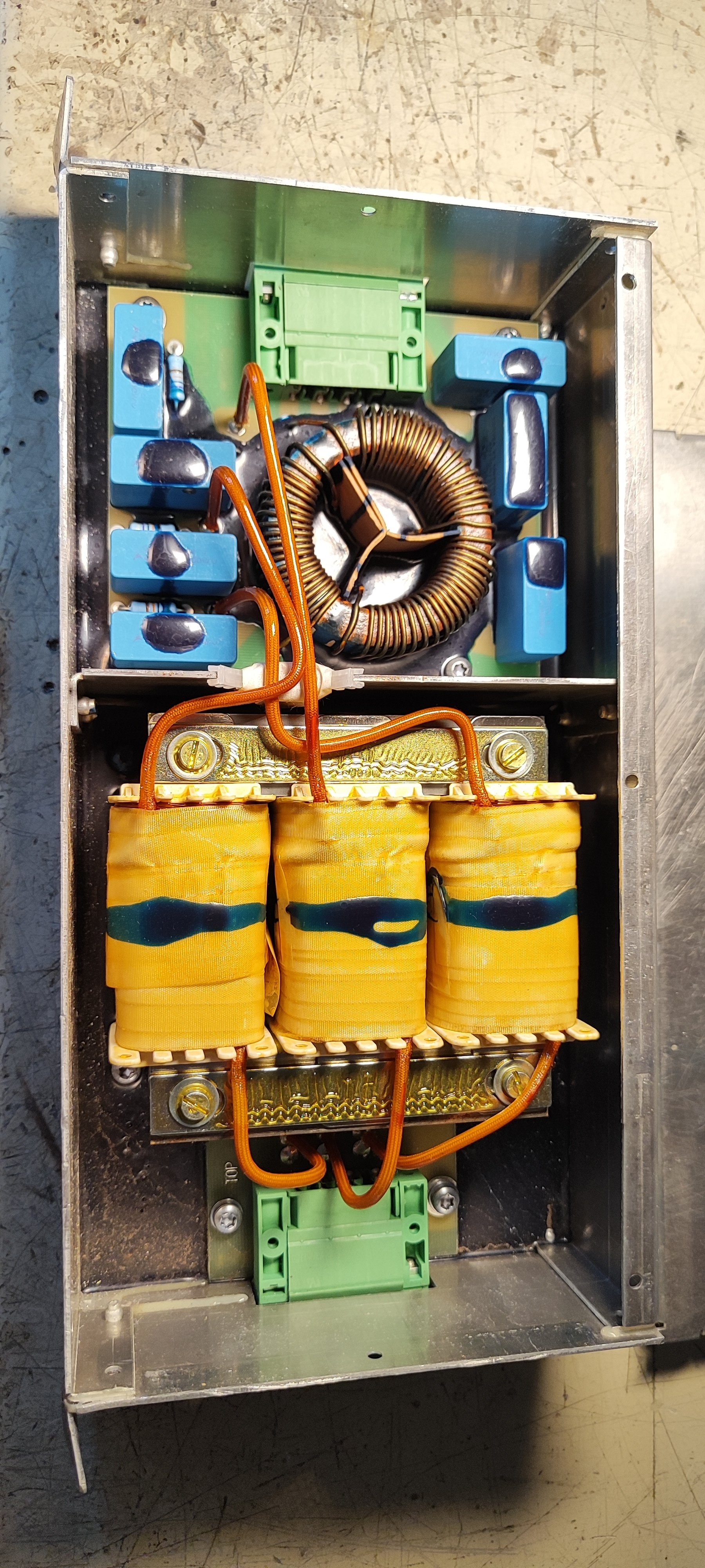 Myslím, že zdroj pretoku je EMI filter na vstupe do FM. Skúsil by som ho dočasne obísť, či pretoky budú pokračovať. Tu je fotka, čo sa v takom 3f EMI filtri nachádza.