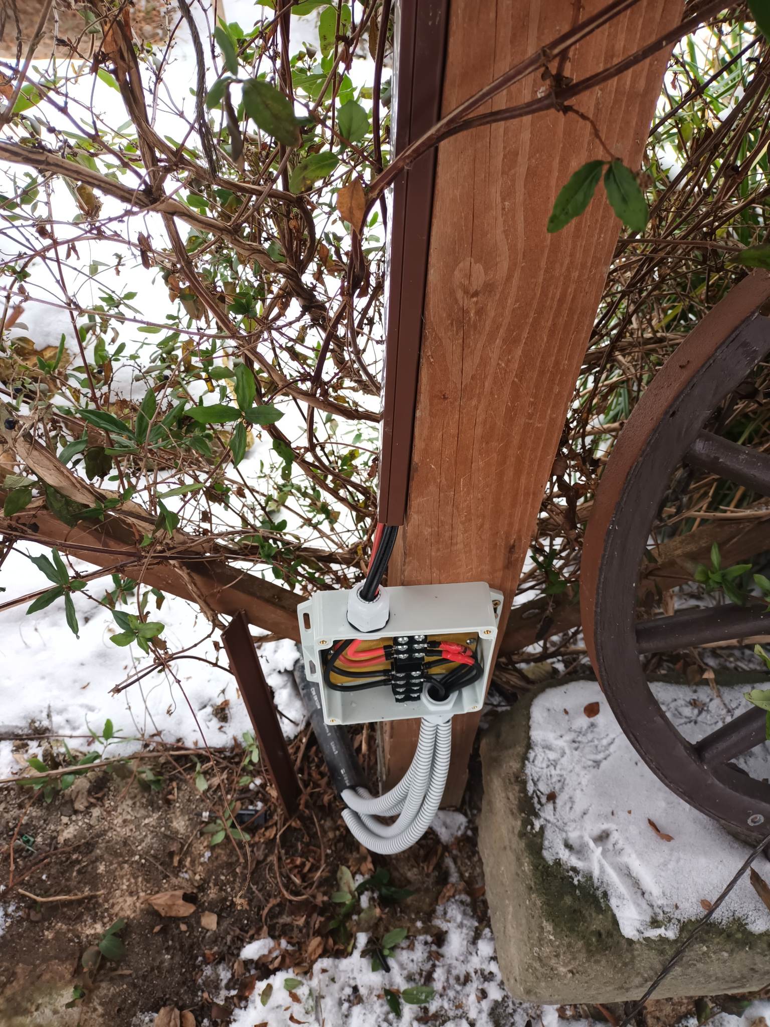 Koupil jsem z GME svorkovnice do 63A, krabici 15x15cm, dutinky a pustil se do toho. Podložka pod svorkovnicemi je ze starého combiboxu (není to dřevo) Zkoušel jestli hoří a ochotná hořet je jen při zdroji plamene bez plamene zhasne. Vzhledem k tomu že to je venku mimo objekt tak to je celkem jedno.