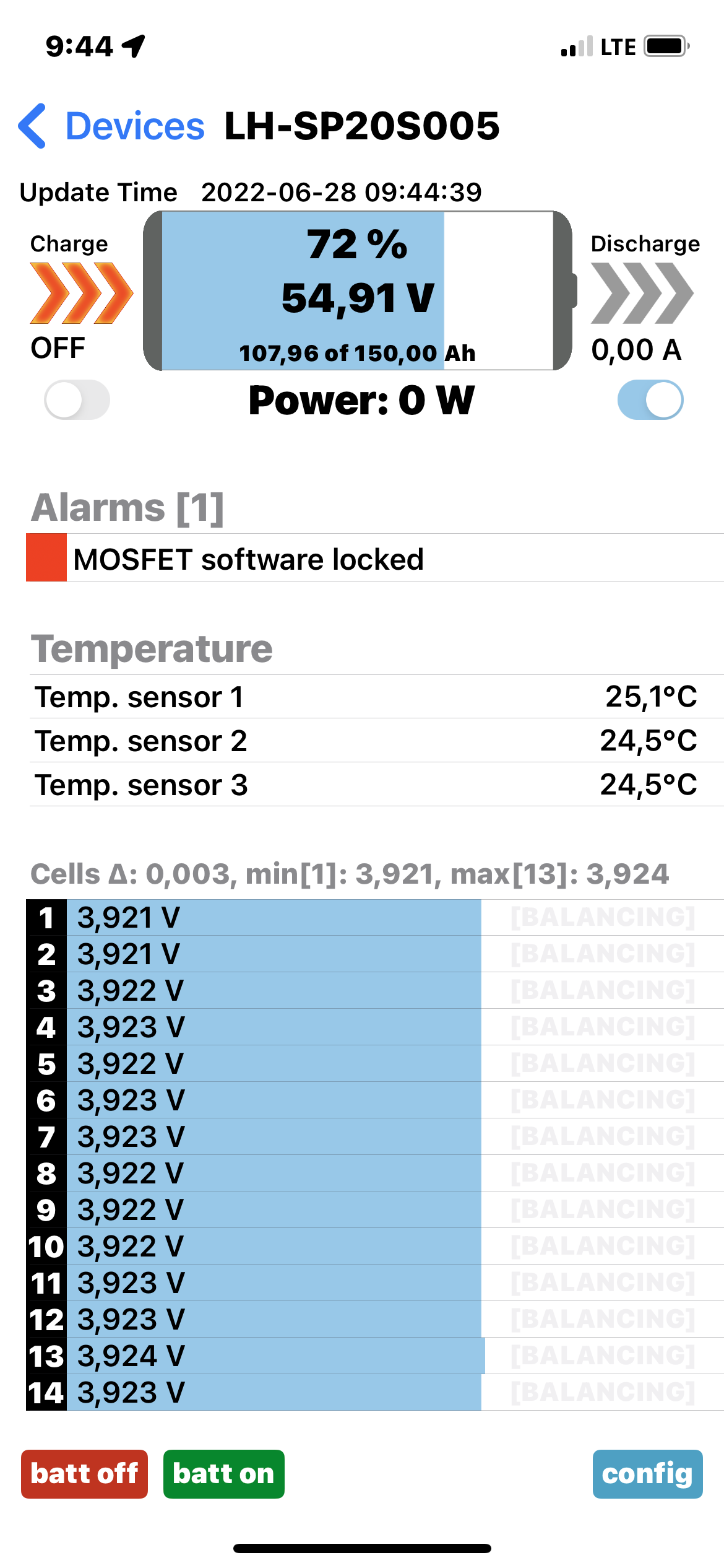 Podívej na oběd jsme pouštěly mikrovlnku a při vypnutí mi to vyhodilo tu lifepo - slyšel jsem cvaknutí tak jsem to šel řešit a vypnulo se to protože jeden článek měl 3.50 (mám nastavené odpojení při 3.50 už jsem to změnil na 3.55) protože při vypnutí mikrovlnky a jak jsou baterky na 100% tak na chvíli vyskočilo napětí na 27.82V než se panely vypnuly a prostě jeden článek vyskočil na 3.50.