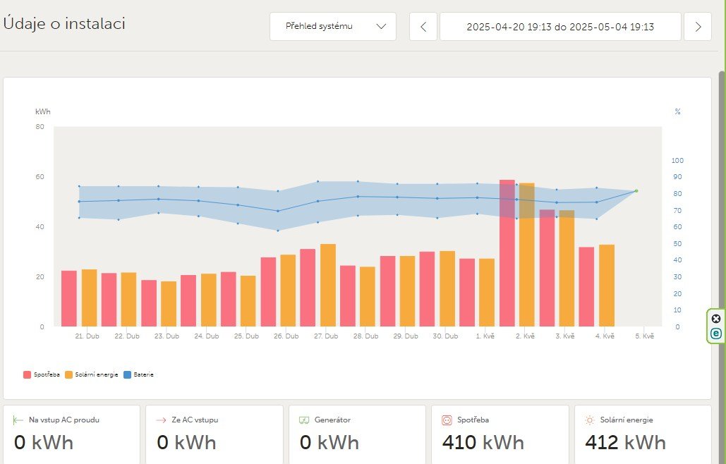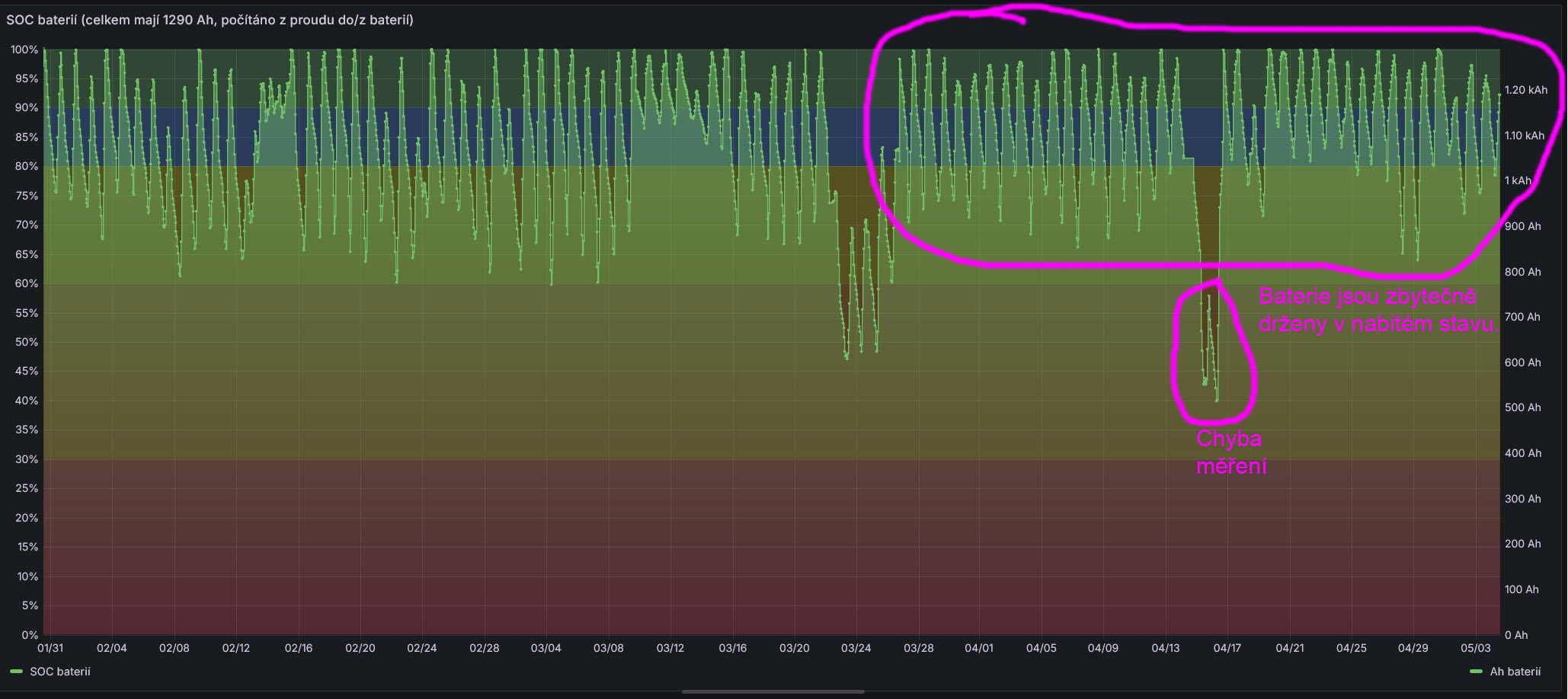 Celkem mě rozčiluje, že přes léto jsou baterie (zbytečně) drženy v dost nabitém stavu. Přitom noci jsou krátké, takže se baterie vždy začne brzy znovu dobíjet.