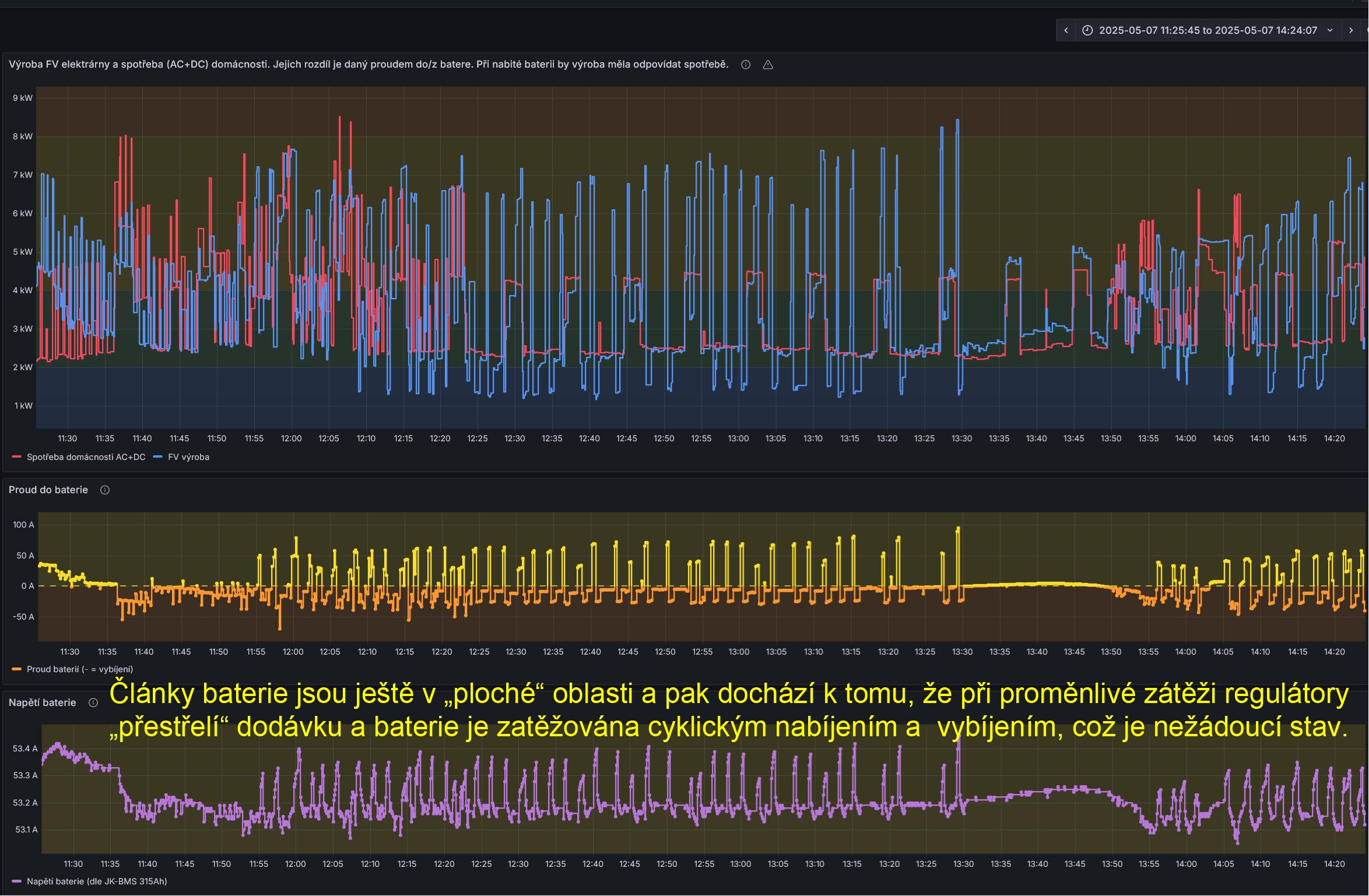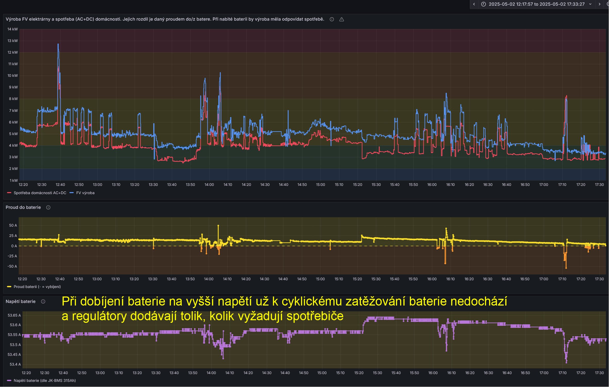 Asi budu muset vrátit dobíjecí napětí zpátky, protože se vyskytl nečekaný "problém". Při dobíjení na 53.2 V jsou články ještě v ploché oblasti a regulátory tak nemají zpětnou vazbu jaký proud mají dodávat. Proudy do baterie pak dost lítají a ta je sice na nižším napětí, ale dost cyklicky namáhaná: