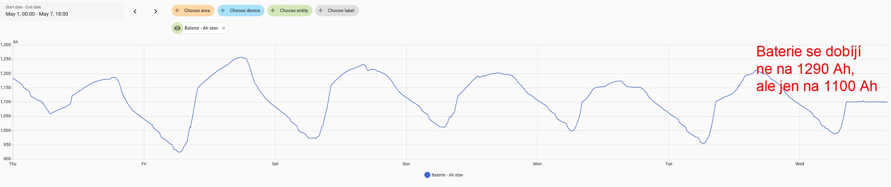 Balancování je problém, musel bych přenastavit začátek na nižší napětí a i snížit rozdíl napětí. Teď jsem ještě objevil, že to předchozí cyklické namáhání zavinila nevhodně nastavená automatizace, která podle SOC přepínala dobíjecí napětí. Možná to vrátím zpět a zkusím nižšího SOC přes léto dosáhnout jinak.