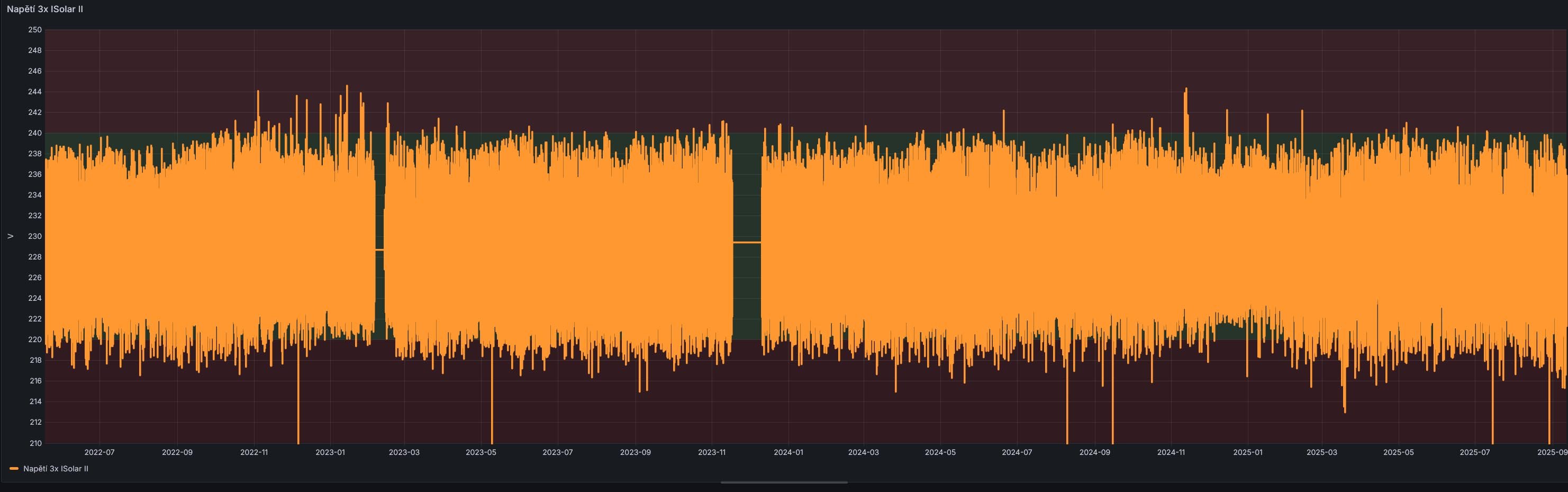 Koukl jsem se jak lítá napětí za trojicí měničů ISolar SM II během posledních 3 roků. Kdyby se časem zvyšovala nestabilita, tak by to třeba naznačovalo, že něco (elektrolyty?) v měničích odchází a můžu se připravit na poruchu. Měřeno pomocí Shelly EM na AC sběrnici.