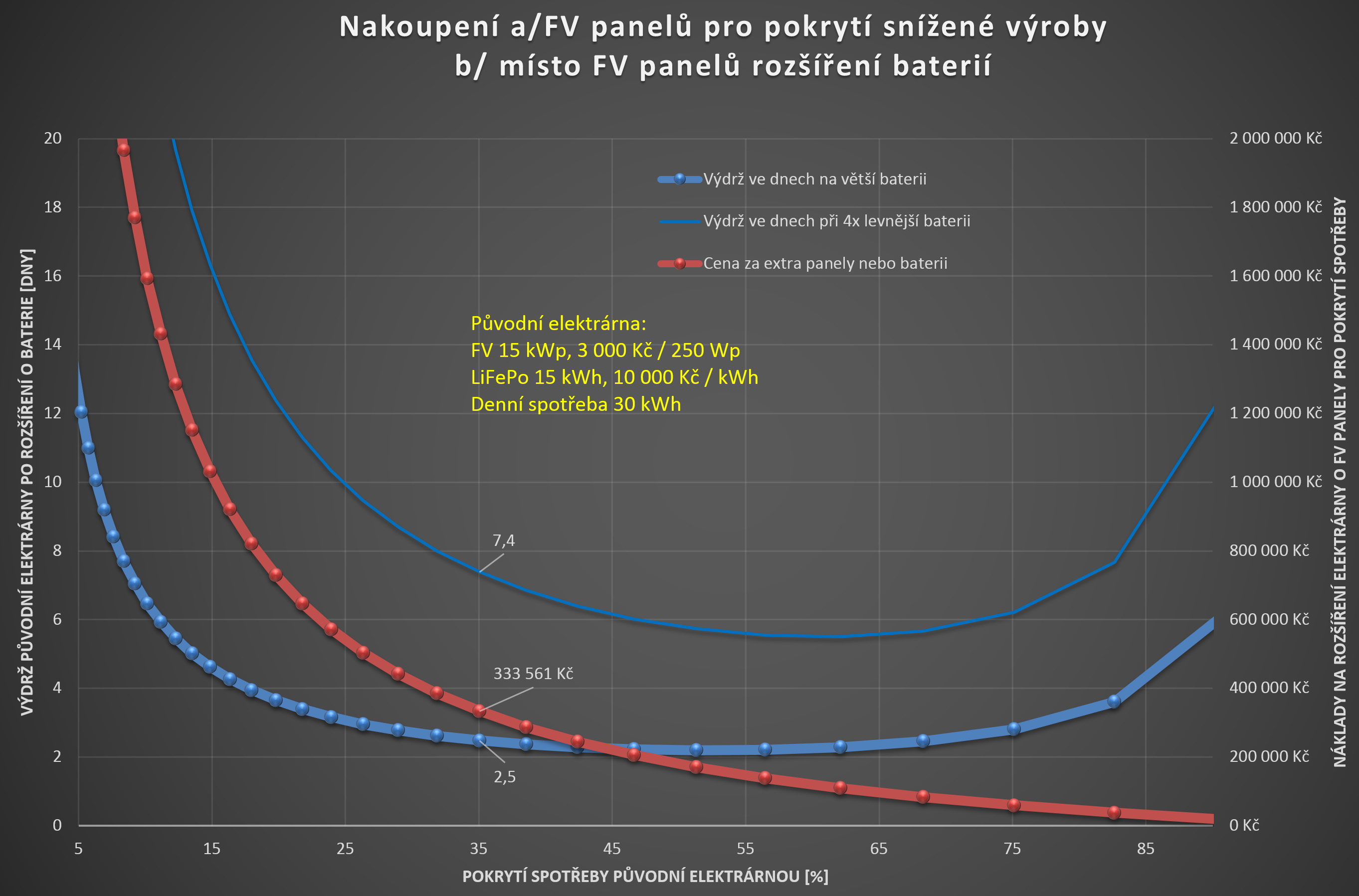 b/ místo do FV panelů ty samé peníze investuji do LiFePo baterií. Ty baterie se nabijí v předchozím slunečném období a umožní mi překlenout období snížené výroby - v grafu vidím, že s extra kapacitou baterií vydržím 2.5 dne. Teda s extra FV panely vydržím stále i při snížení výroby na 35%, s extra bateriemi jen 2.5 dne.