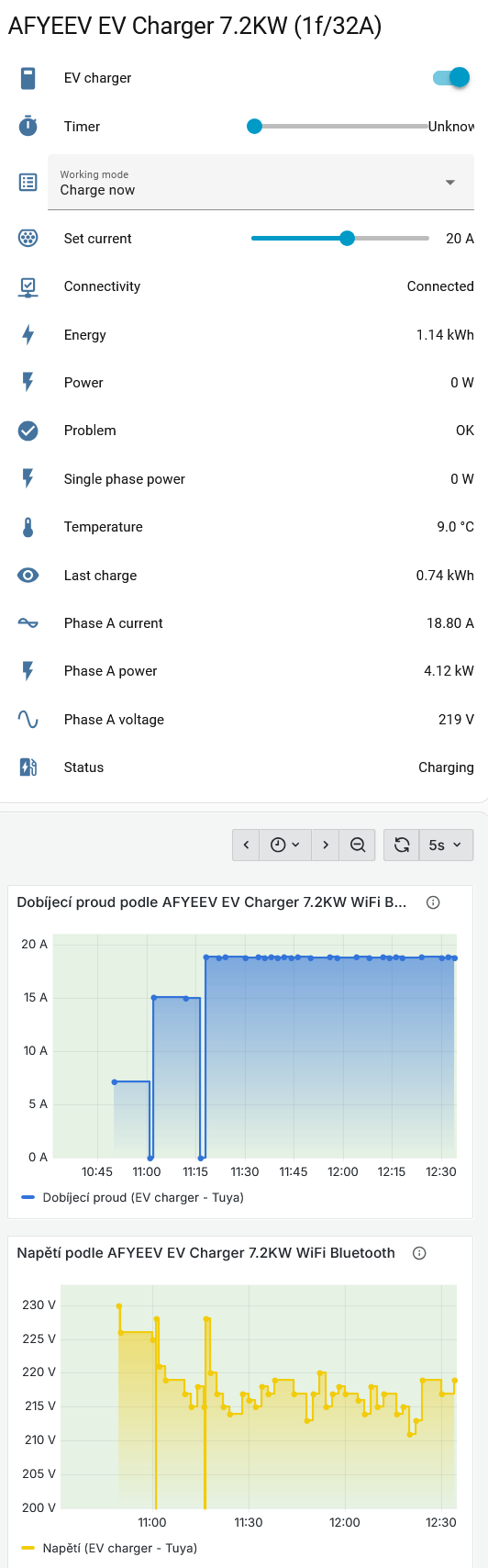 Čínský "wallbox" je integrovaný v HomeAssistant přes tuya (mám ho přes tuya local, takže nepotřebuje cloud) a umožňuje za dobíjení měnit proud. Ne teda z jedné hodnoty přímo na druhou, ale když nastavím jiný proud, tak na chvíli přestane dobíjet a pak začne na nové hodnotě proudu. Zvažuji jestli v automatizaci pak nesledovat i napětí na wallboxu. Pro detekci případného uvolněného kontaktu a vypnutí dobíjení než někde začnou sršet jiskry.