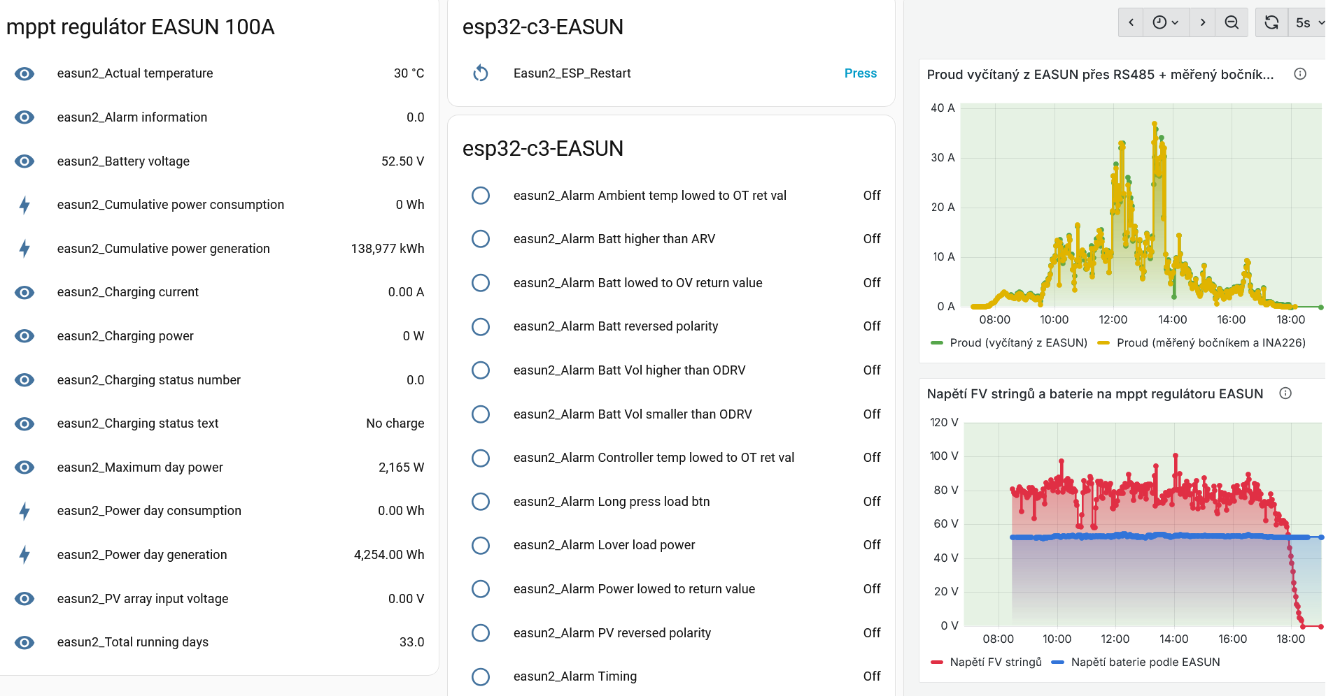 Pár FV panelů je připojených na mppt regulátor EASUN 48100 (100A) a tak jsem doplnil sběr dat do HA pomocí převodníku RS485/TTL na esp32_C3. Na RS485 už ani nedávají konektor, tak se musí pájet. esp32_C3 mám s displejem, tak na něm rotují základní hodnoty.