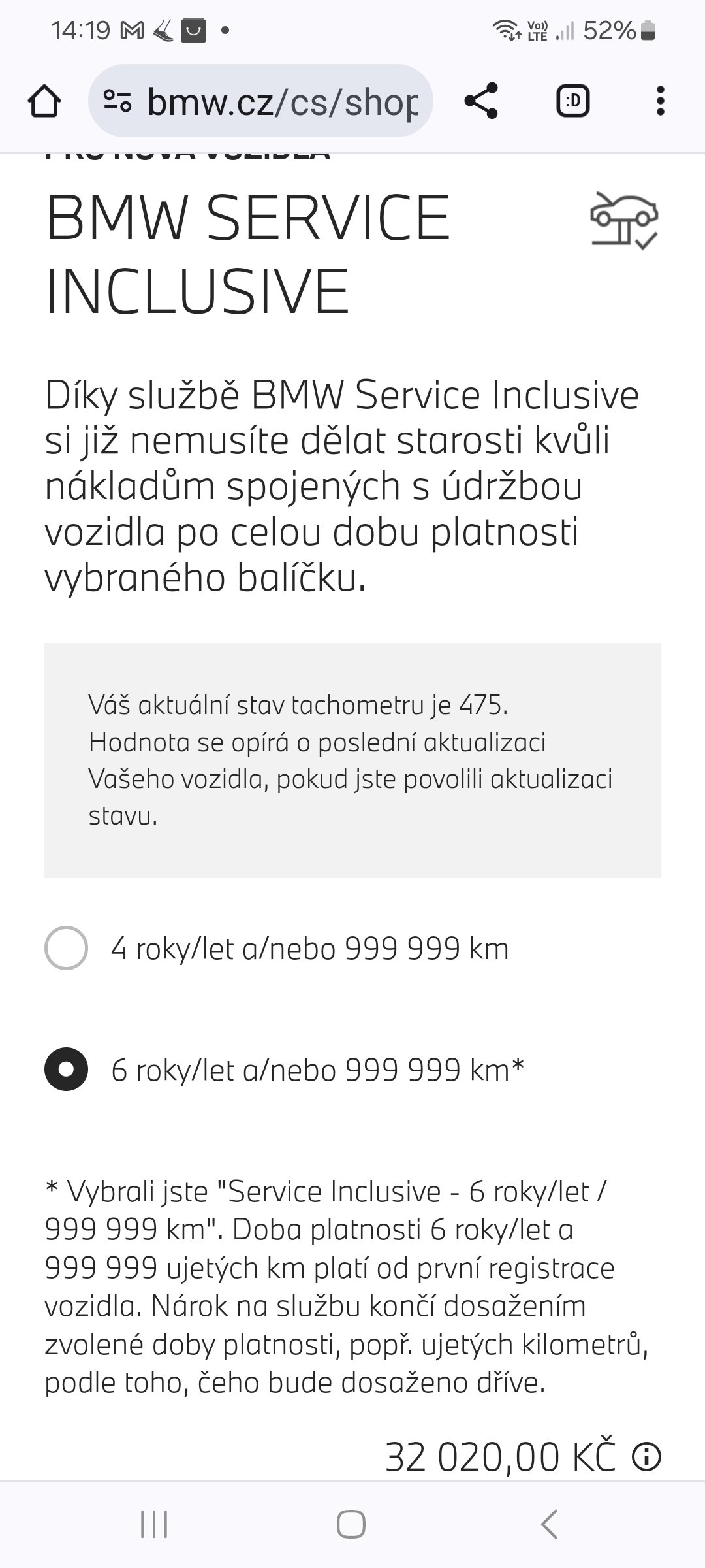 BMW mi nabízí servisní balíček bez omezení kilometrů na 6let za 32000kč s DPH a první návštěvu servisu mi v APP píše za dva roky.