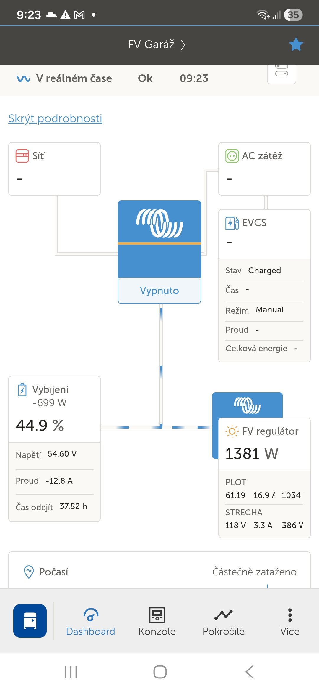 V tento moment běží už jen sušák na boty non-stop 60W = 1,44kWh a taky 500W = udržování FV-cimry na 7-8°C který se zapíná 2-3x za den - se spotřebou 800Wh - 1,5kWh - PLUS NEMALÁ VLASTNÍ SPOTŘEBA CELÉHO SYSTÉMU - a ty 4 Stringy s max. výkonem 7,35kWp na to nestačí....