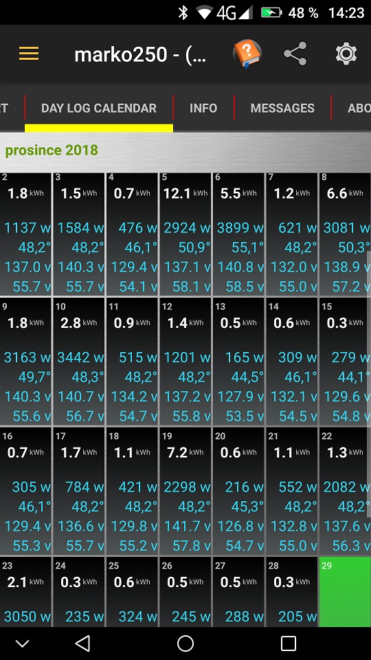 Letos to ujde,ve čtvtek plně nabito a ještě i infrasauna , v sobotu plně nabito a dnes tak půl a zbytek v době nt ,nastaveno 10 ampér,letos cca 15 dní zbytek na sluníčko,samozřejmě mimo žroutů na tři fáze,ty jdou celý rok na ds,hezký podvečer