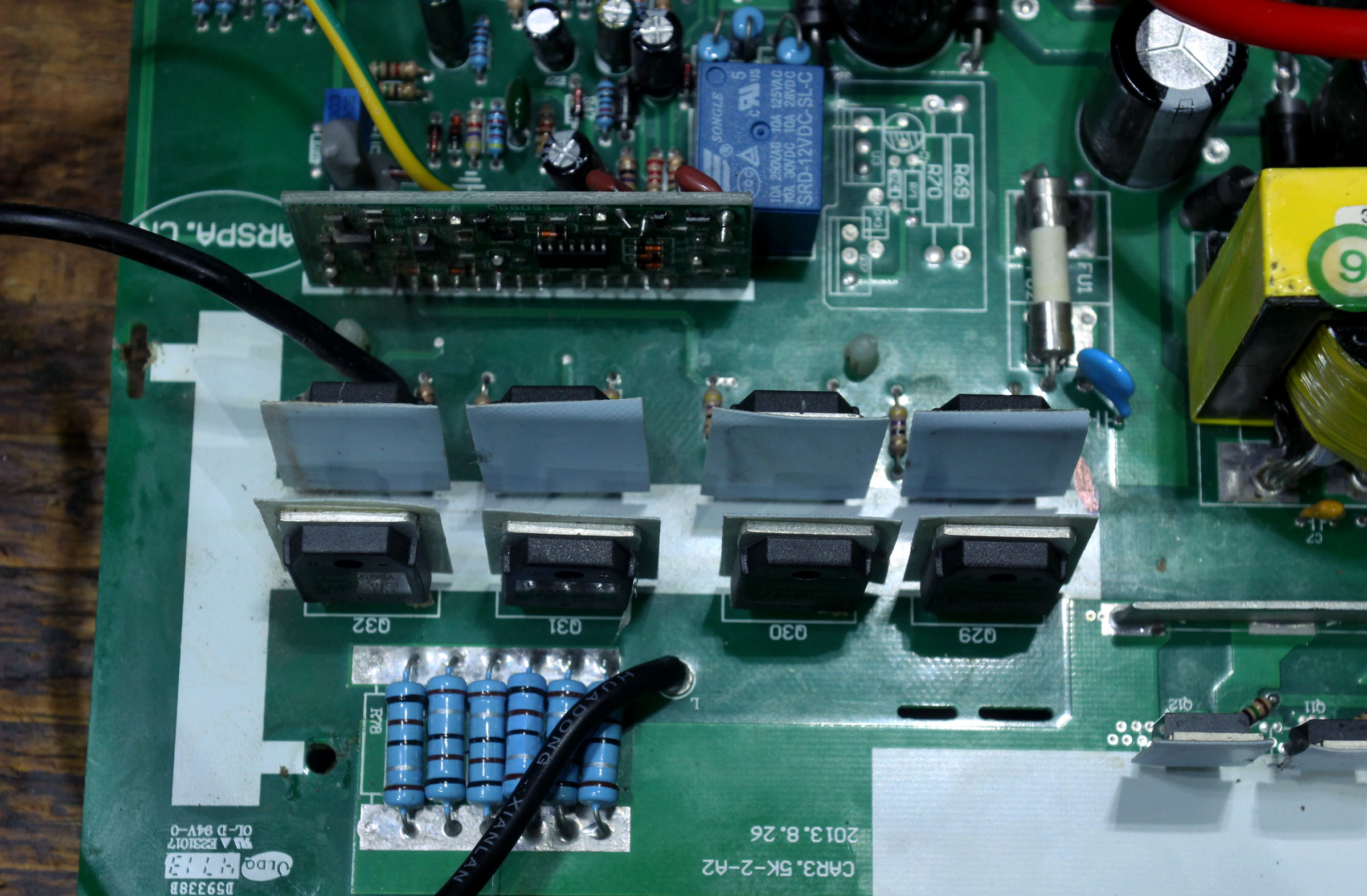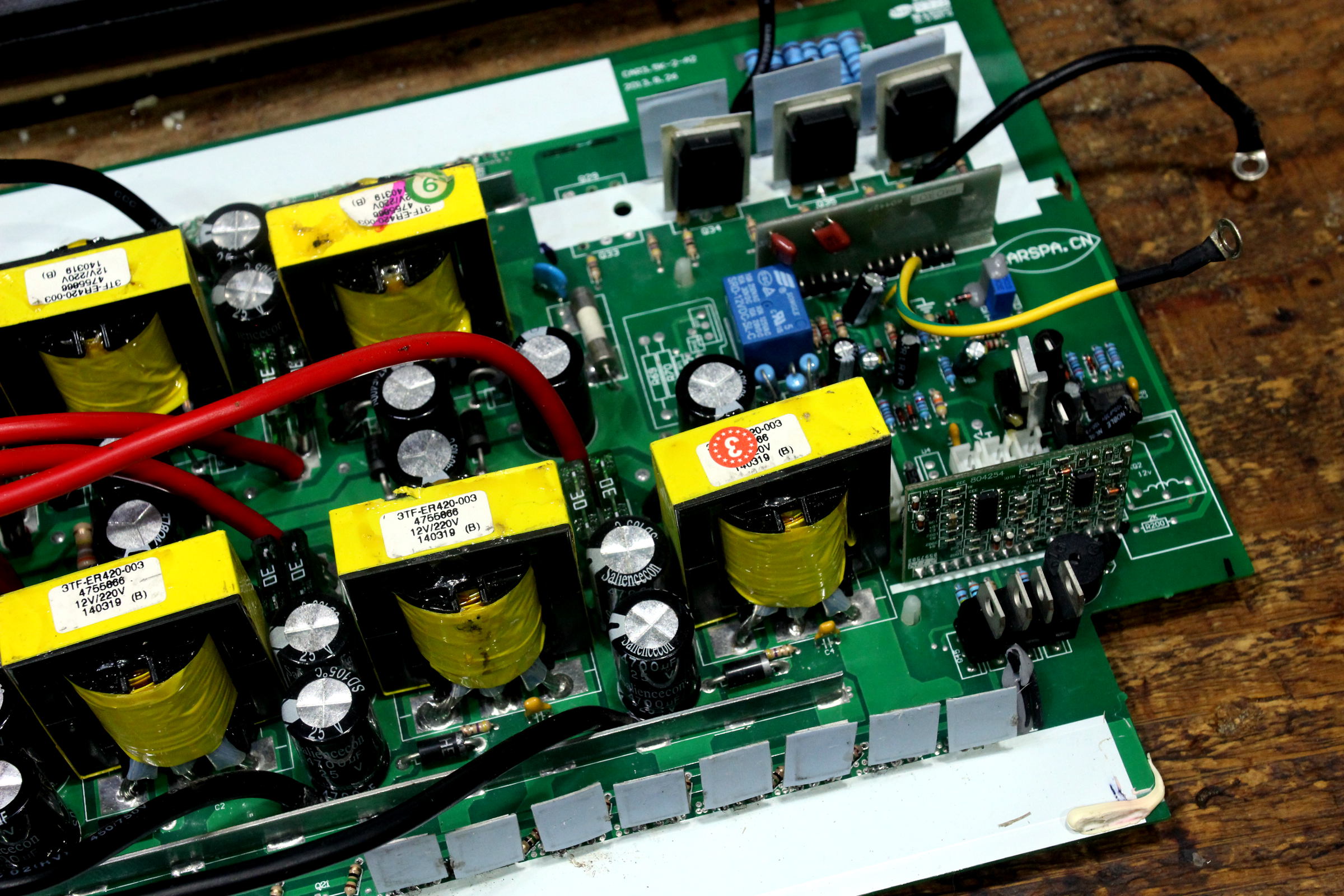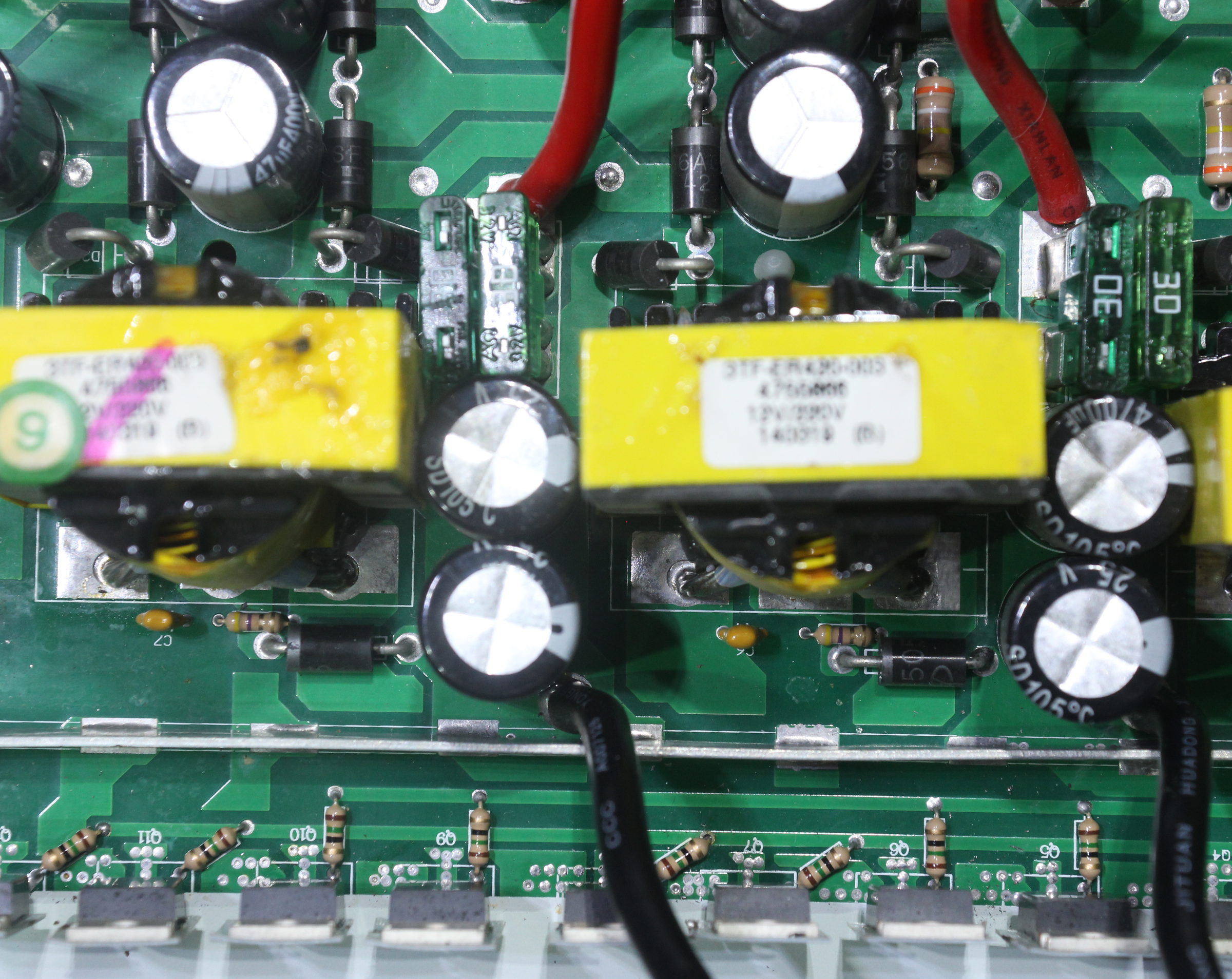 Takýchto sekcií, kde sú 2 x Saliencecon 25 V 4700 uF, 1 x 400 V 47 uF, 5 diód a trafo 12/220 + 4 FETy,