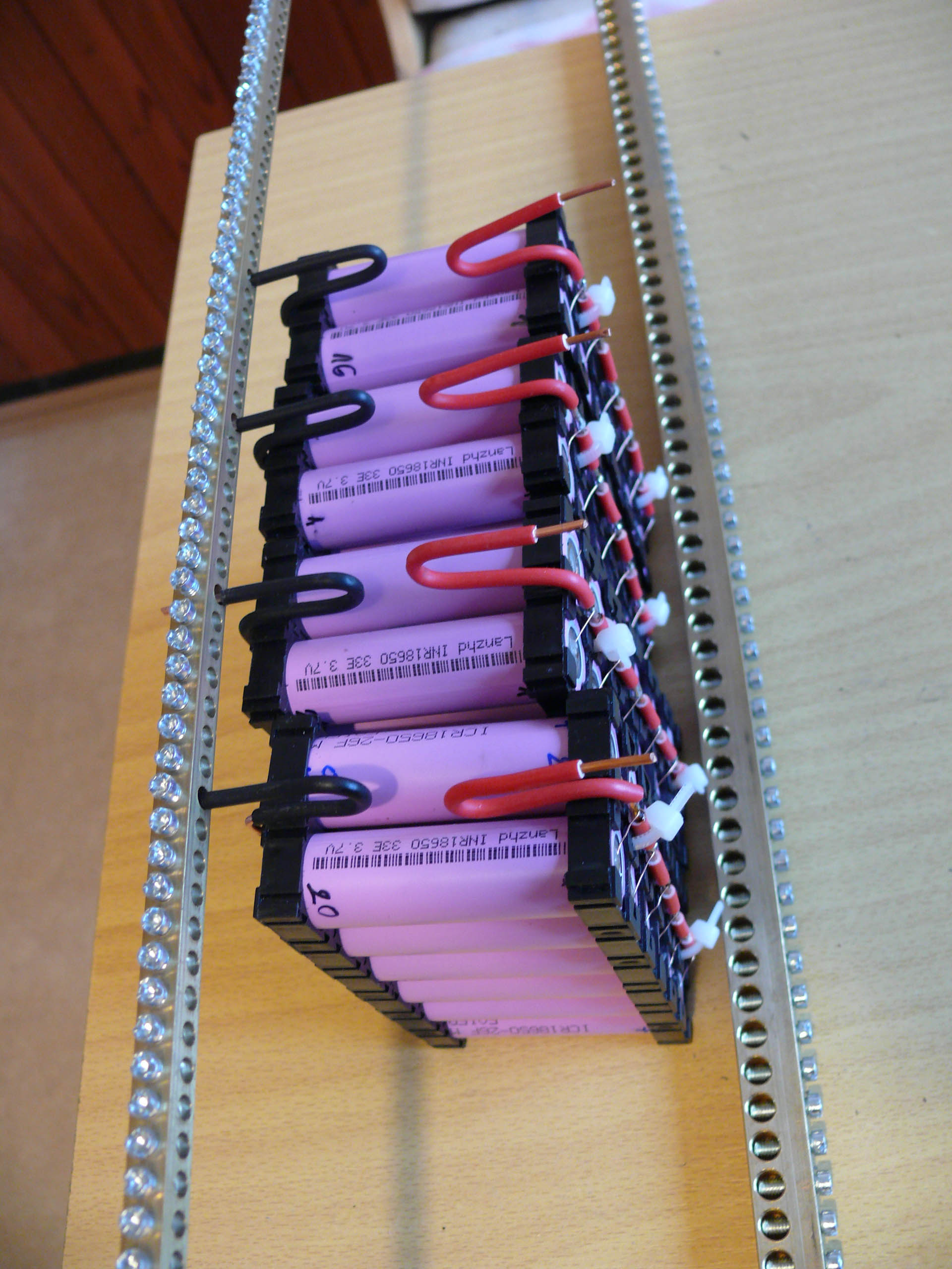 Robim bateriu pre fotovoltaiku. Maximalna kapacita 48V/350-380Ah. V prvej etape bude osadena kapacita zhruba polovicna. Bateria bude zlozena z jednotlivo demontovatelnych modulov 4.2V/30Ah(priblizne). Podobne a demontovatelne moduly budu aj z prizmatickych clankov. Samotna bateria nebude obsahovat ziadne silove vodice s jedinou vynimkou. Samotne clanky. Silove vodice budu iba na privodoch k baterii. System montaze modulov - nulovaci mostik. Nasledujuce foto ukazuje ako asi bude vypadat v realite. Umiestnenie vo vanicke z nevodiveho materialu s protipoziarnym naterom a pocitam s moznostou zaliatia vodou. Ale definitivna verzia konstrukcie este neexistuje (stale zberam informacie a skusenosti z fora a internetu). Pri konstrukcii tejto experimentalnej baterie budu zatial pouzite styri typy modulov. ModulPrizma prizmaticke clanky 4.2V/30Ah/5A, modul40A 4.2V/30Ah/40A, modul70A 4.2V/30Ah/70A a modul80A 4.2V/30Ah/80A. Posledny prudovy udaj zodpoveda maximalnemu spickovemu prudu clankov pouzitych v module. Kompletne osadena bateria by mala vediet trvale dodat az 100-120A/48V a kratkodoba spicka 300A by nemal byt problem. Nabijacie prudy spolahlivo 60A ale znesie aj 100A spickovo a kratkodobe snad 120A. Istenie baterie bude na 300A.