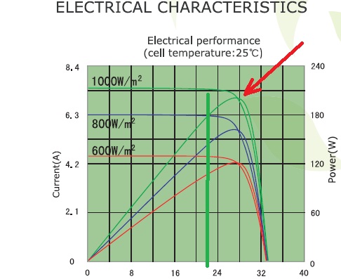 Asi si nerozumíme, to je graf FV panelu a šipka ukazuje na optimální bod pro maximální využití energie při 1000W/m2.
