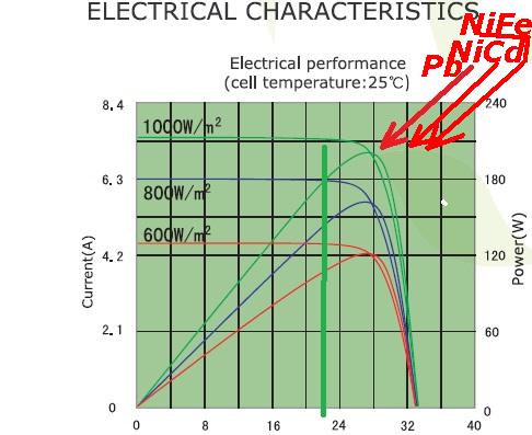 20ks článků je nominálních 24V, nabíjecí napětí 30,8V, znak nabití je 33,4V. Takže graf pro 230Wp panel je docela odpovídající nabíjecí charakteristice NiCd... při nabitém akumulátoru klesne i efektivita panelu. Takže to vidím jen na dostatečné kapacitě akumulátoru vůči panelům.