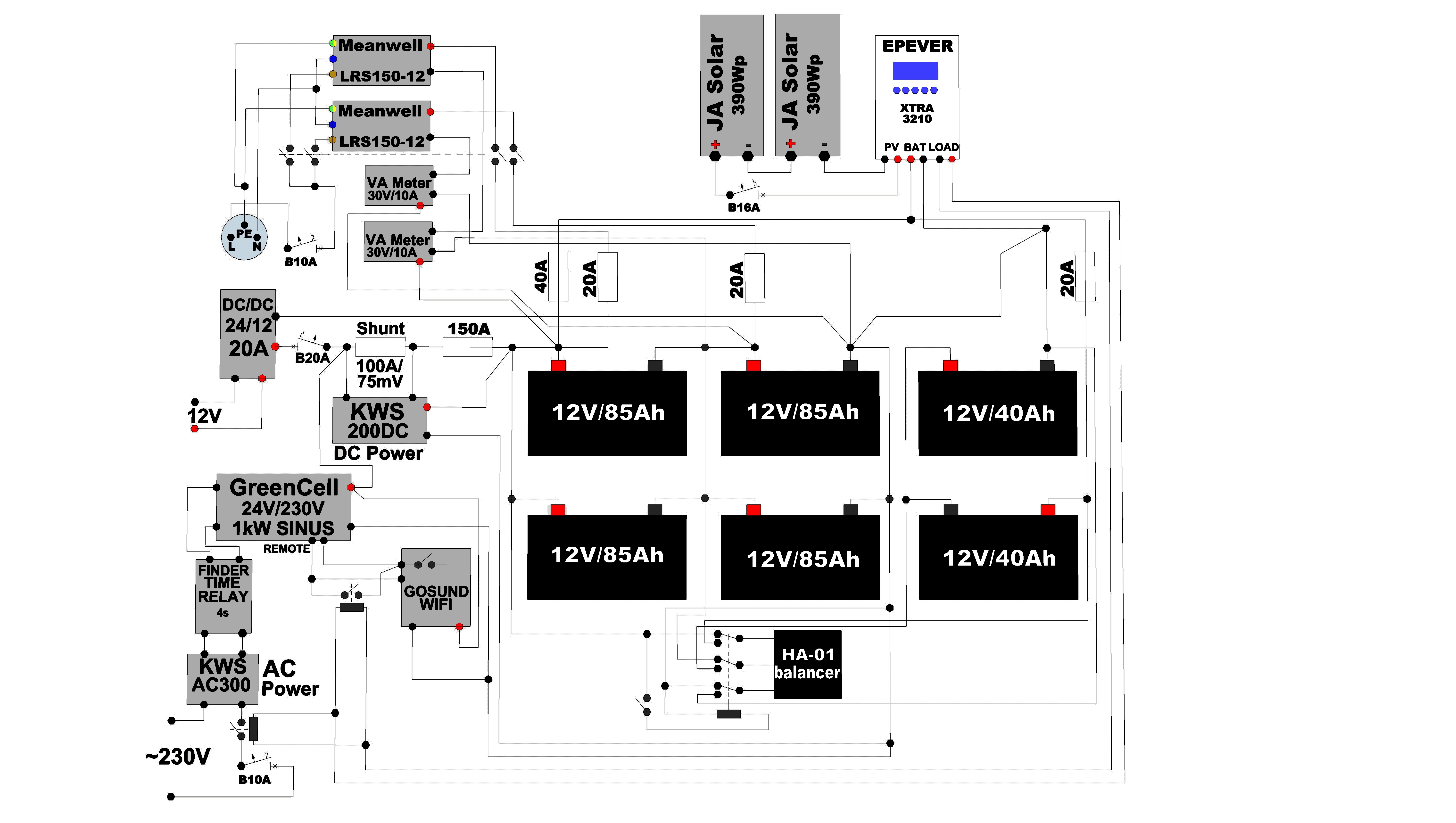 Moje bateriove ulozisko je 4x GreenCell VRLA 12V/84Ah(110€/ks) v konfiguracii 2s2p a ako zalohu v pripade odpojenia hlavnych AKU od regulatora 40Ah blok zlozeny z mensich 7Ah akumulatorov.