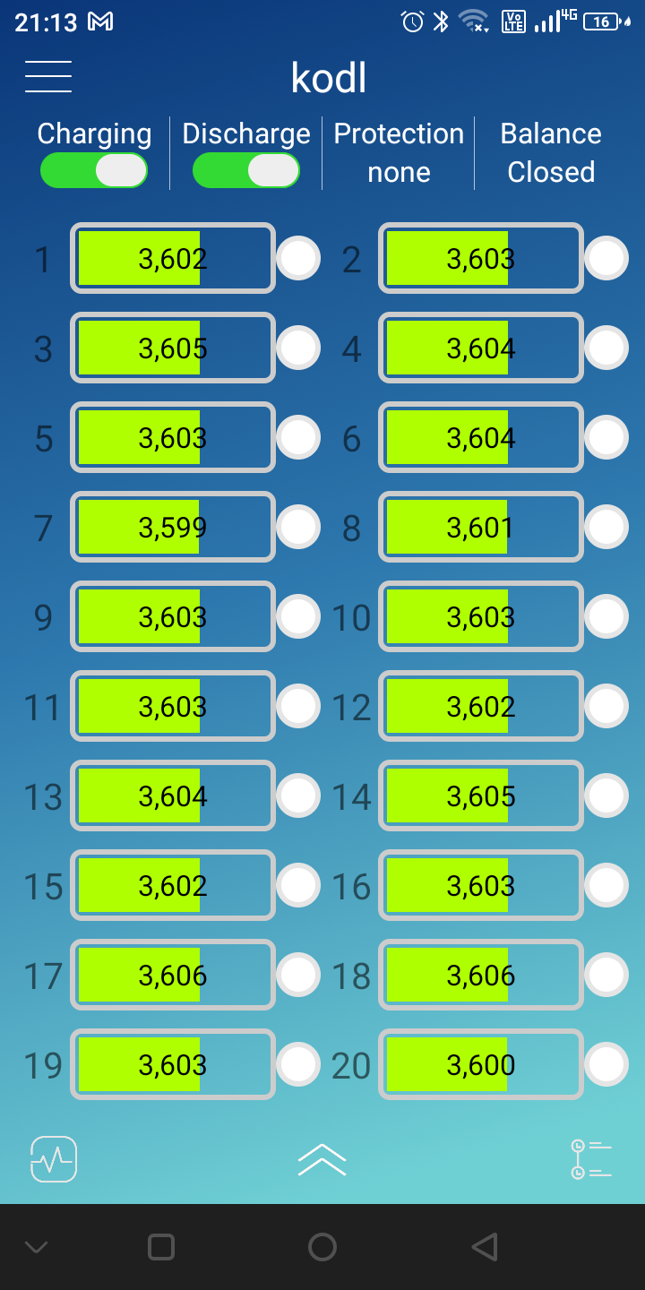 P.S: nový baterky není potřeba moc balancovat, ale různý bazarový vydechliny se samovybíjením řádu několika Ah denně (z cca 300Ah) , každej článek s jinou kapacitou minimálně o 10%, už smartbms neuhlídá, ale tohle jo, osobně ověřeno. Dokonce jsem tím nechal srovnat články 300Ah s napětími od 3.3 do 3.8V, za čtrnáct dní měly všechny 3.6V...