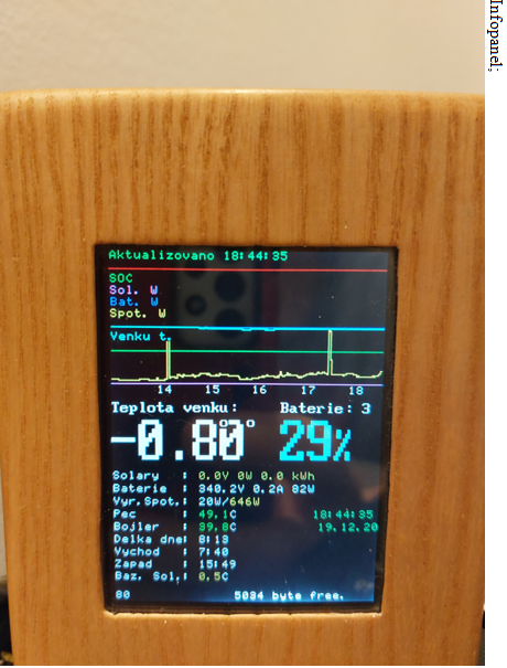 Z předchozí realizace mi zbyl 7“ palcový display, raspbery a kabeláže. Takže jak to zužitkovat? Komunikace modbus po 485 na GoodWe je paráda a vlastně po malých úpravách starého infosystému jsem aktualizoval do současné podoby.