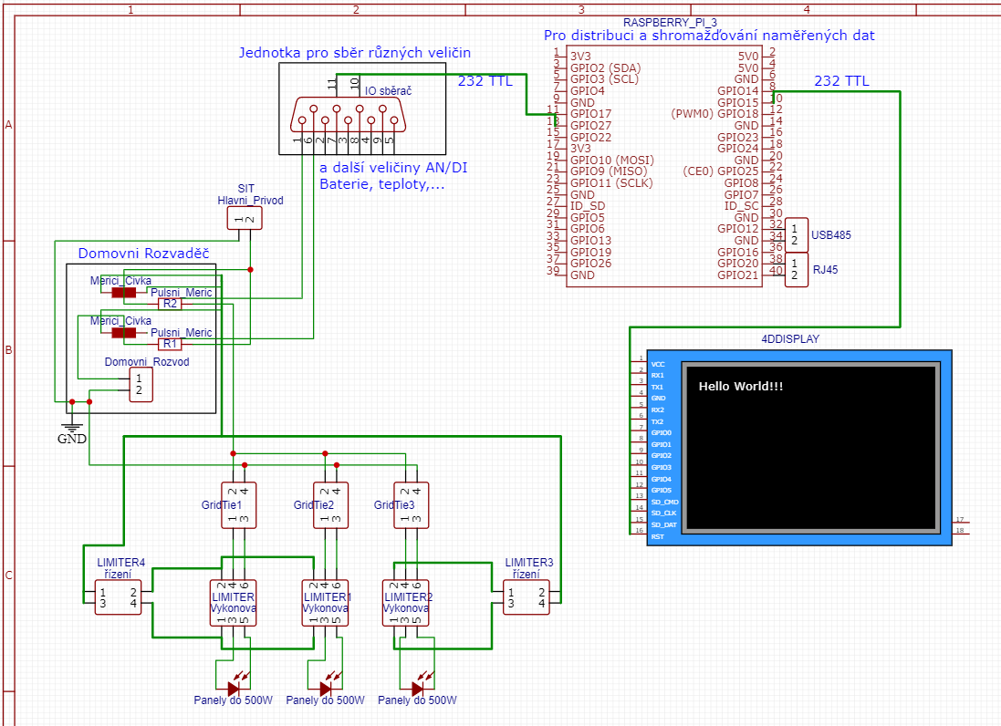 Pro samotné měření výroby a spotřeby pro statistiku jsem použil jednofázové měřiče s pulsním výstupem. Celý sestém byl rozdělen na 3 samostatné okruhy. Jeden se staral o výrobu, druhý o poskytování informací a třetí je 12V systém se zálohou.