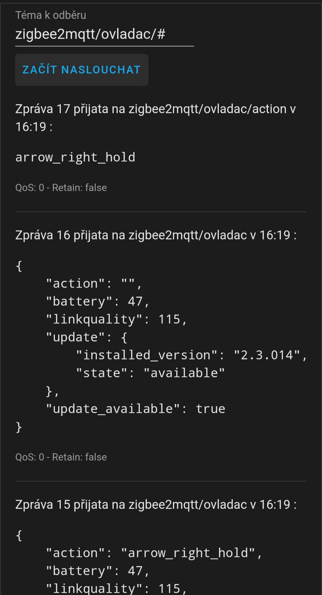 Zpráva 1 přijata na zigbee2mqtt/bouda-vypinac1 v 22:19 : - zmáčknutí