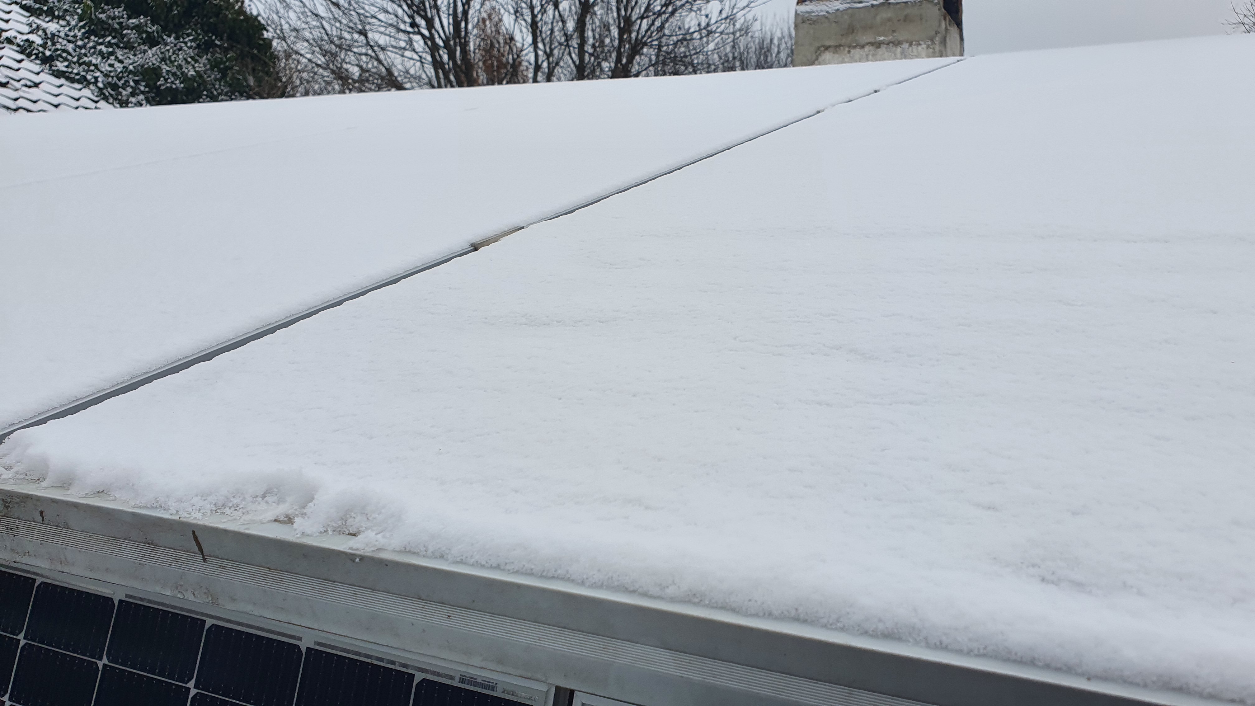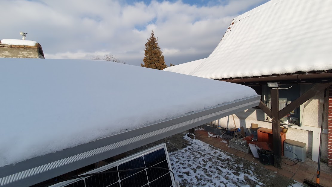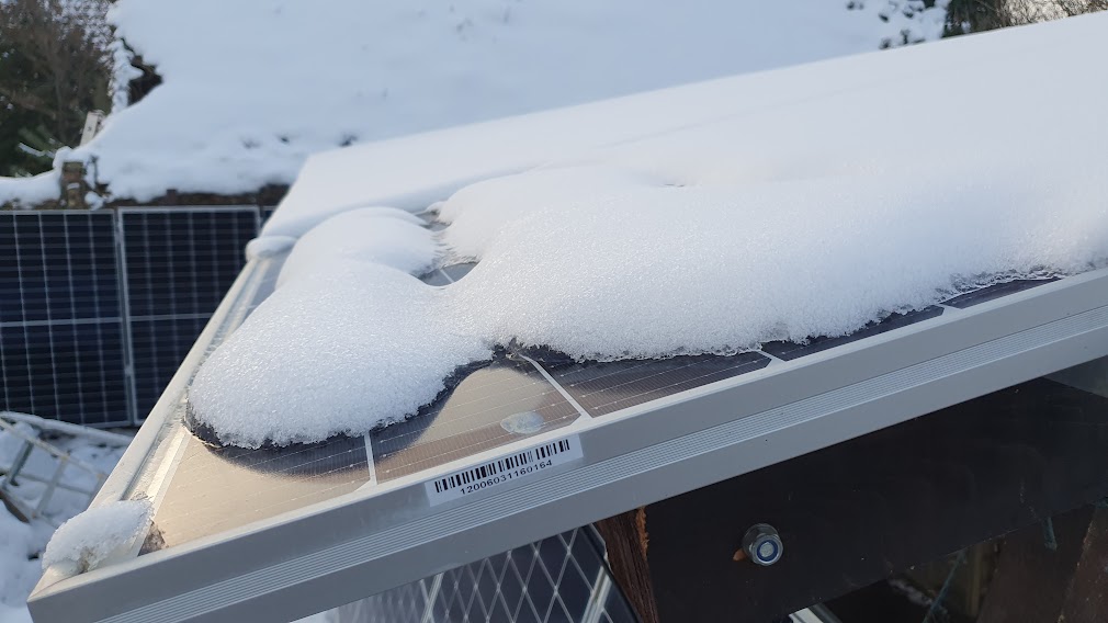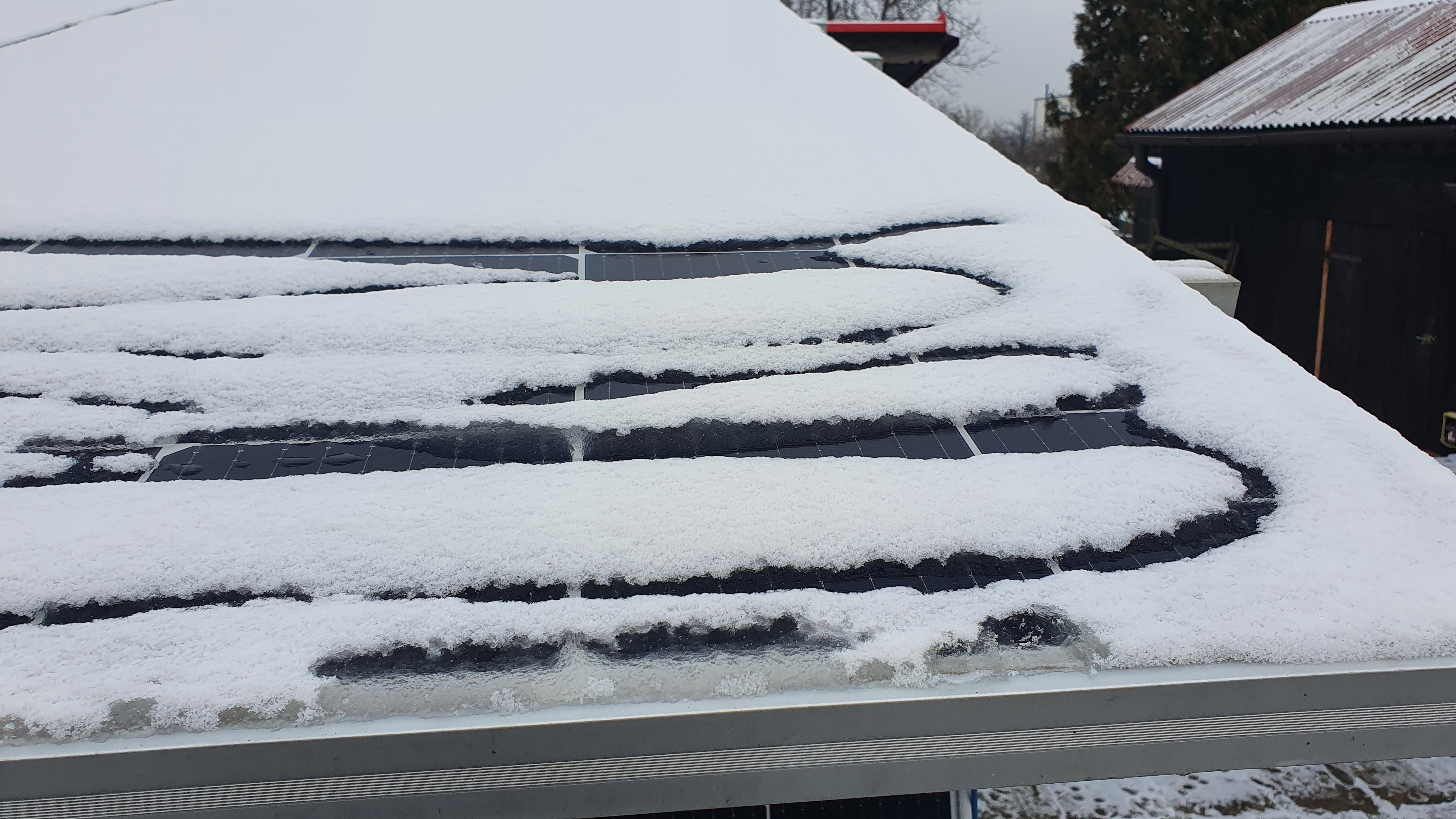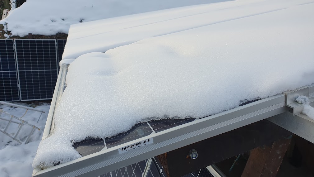 Při malém sklonu je to problém. U nás v jižní nížině po dlouhé době něco napadlo a stále drží. U mých panelů se sklonem asi 40° došlo při slunném dopoledni k sjetí 7 cm vrstvy, která se ale zasekla o sníh na střeše pod panely. Dlouhým bidlem jsem rozrušil mosty pod spodní hranou panelů a ten zbytek zase popojel. Na 4 pokusy to šlo dolů celé. Ona i takto silná vrstva je asi trochu průsvitná a černá barva panelů se asi trochu ohřeje, dokonce i nějaký ten ampér to dávalo. Největším problémem je asi 2 mm schodek u spodní hrany, ten kdyby tam nebyl, asi by to sjíždělo ještě lépe.