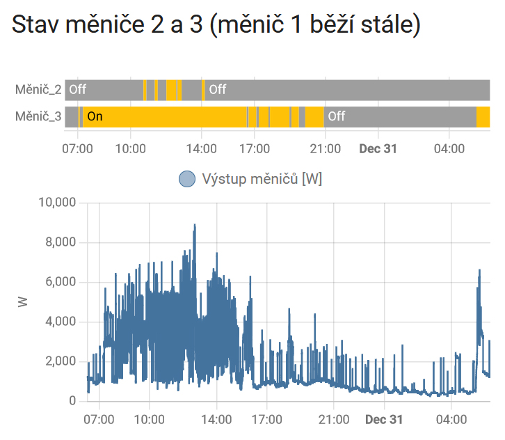 Victron mi běží stále, REVO zapínám pokud je dost elektřiny z panelů. Na jednom mám myčku s pračkou a na druhém sporák. Teď přes zimu jsou REVO vypnuté, zapnu je až "to budou panely stihat".