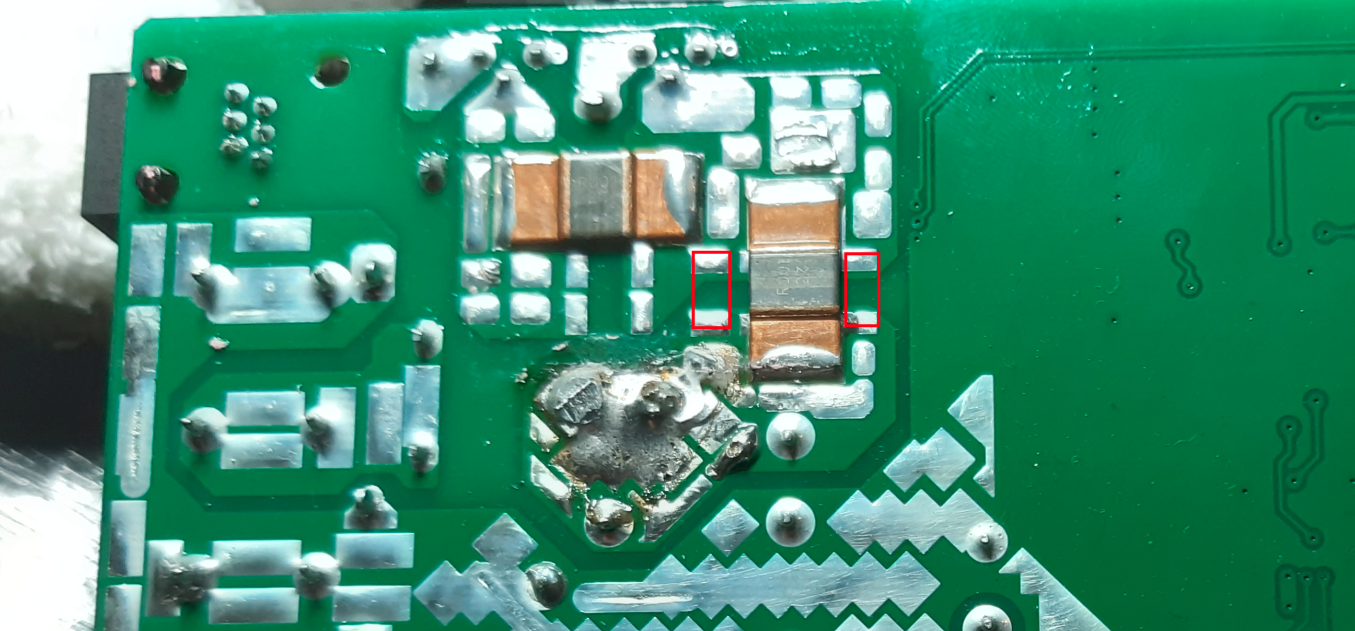 Ale jo, rozebereš, odmontuješ opatrně příchytky na chladič a otočíš desku spojů. Koupíš výkonové rezistory "R004", tedy 0,004 Ohmu SMD provedení, vhodnou velikost uvidíš na tom spoji (viz červené obdélníčky). Na fotografii jsou červeně označena dvě místa, kam rezistory přijdou. POŘÁDNĚ PŘIPÁJET, přes každý poteče 10A. Na okrajích nesmí zůstat boule cínu, aby se na rezistory chladící podložka dobře přitiskla. Smontovat dohromady, ideálně gumové chladící podložky mosfetů podmazat na obou stranách teplovodivou pastou pro lepší přestup tepla. Mosfety to vydrží, jsou asi 5x předimenzované. Stejně výkon většinou zadrží tepelná ochrana, pro využití max výkonu je tedy nutné přidat za chladič větráček 12cm, třeba spínaný teplotou 40°C.cipis píše:Můžeš se prosím k tomu hacku 40->60 víc rozepsat? Třeba i v novém vlákně?