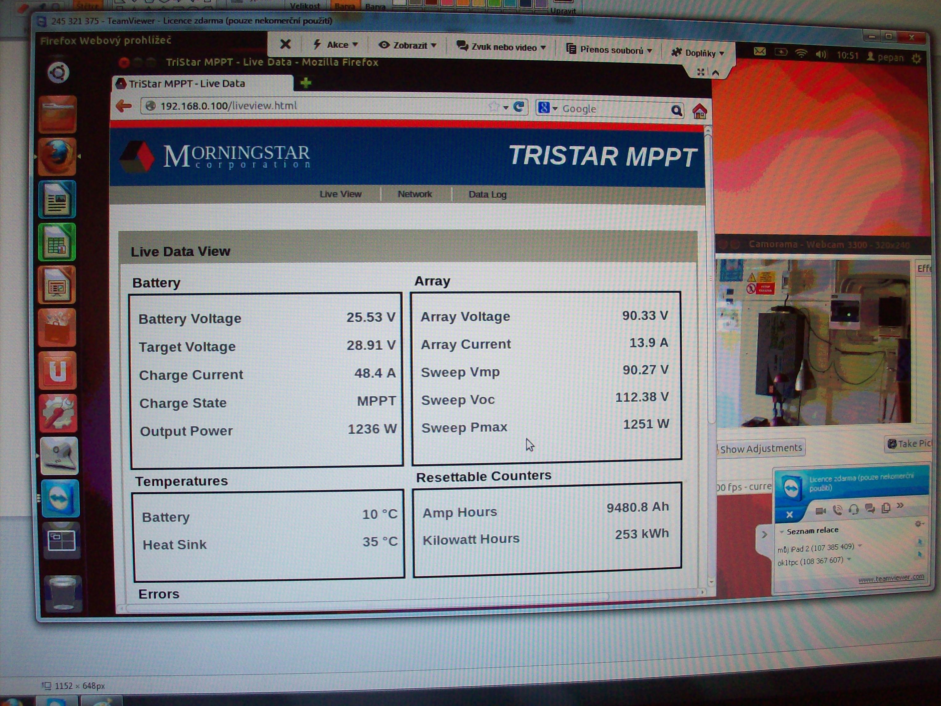 Konfigurace je 6x panel poly 240W,dva stringy po třech panelech,regulátor Tristar MPPT 60A,měnič Mean Well 3000W/24V,