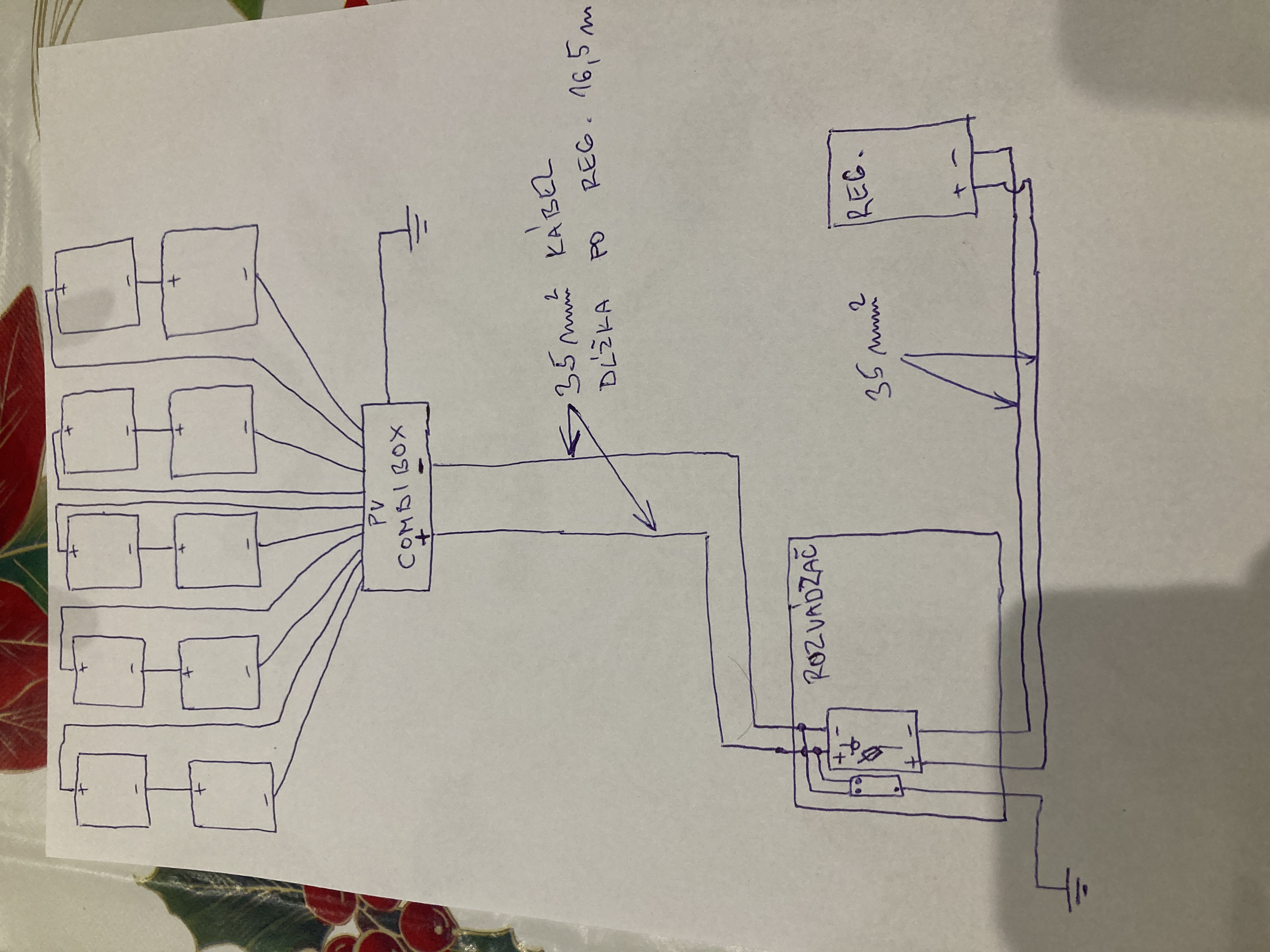 Ano toviem ze napetove aj s amperami sa zmestim do toho epeveru aj v zime ale cital som ma fore ze cez leto moze klesnut napetie pod sesdesiat voltov s tych 84 co sa mi nezda..preto som napisal aby som mal istotu.ono clovek uz ked dlho cita tak ma stoho asi poriadny gulas..inak ako si to myslel stym prierezom na tie ampere?mam tam napisane ze dolu od panelov pojde 35mm2 kabel co by malo bohato stacit na 60A co tade potecie a aj ubytok napetia nebude velky..v prilohe som to nakreslil ako to cca bude, nekreslil som tam zapojenie v combiboxu tam budu poistky a prepetovkaKostěj píše:No 10 panelů se po třech zapojit nedá. Takže dva panely do série, a to celé 5x paralelně. Proudově i napěťově v pohodě. Váš Epever umí 80A a potřebuje z panelů alespoň o 2 volty víc, než má baterka. Nechce se mi kontrolovat napětí panelů pro 50°C, ale mělo by to ještě vyjít. Akorát se od panelů k Epeveru musí táhnout víc kabelů, poteče tam přes 50A, je třeba zkontrolovat průřezy.Migel píše:Teraz ich mam zapojene do serie ale len do bojlera.,idem to prerabat a mam celkovo 10 kusov panelov