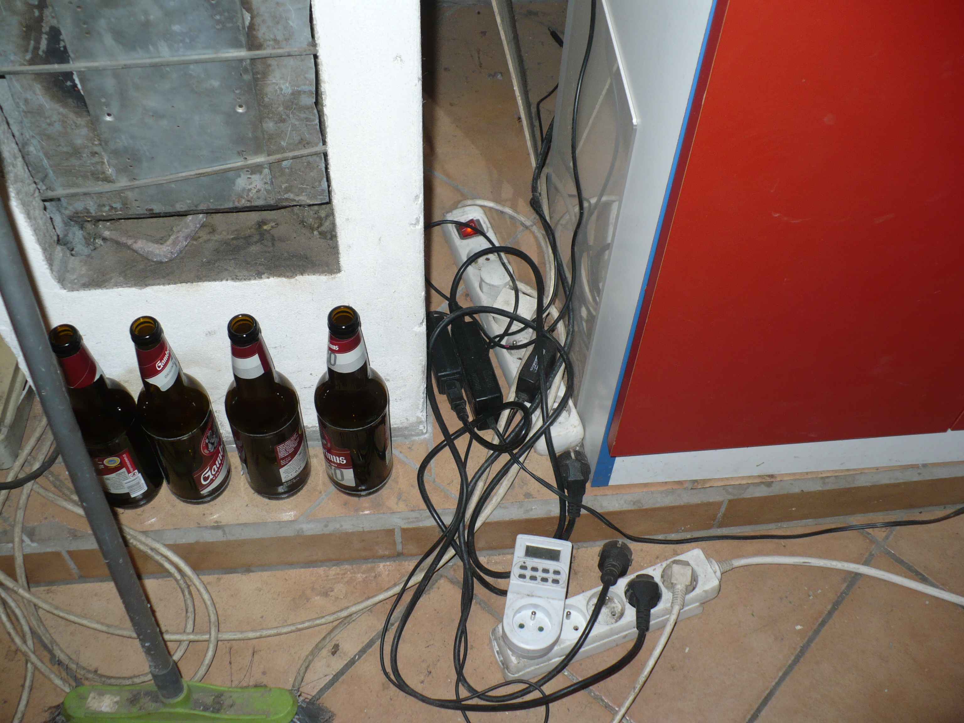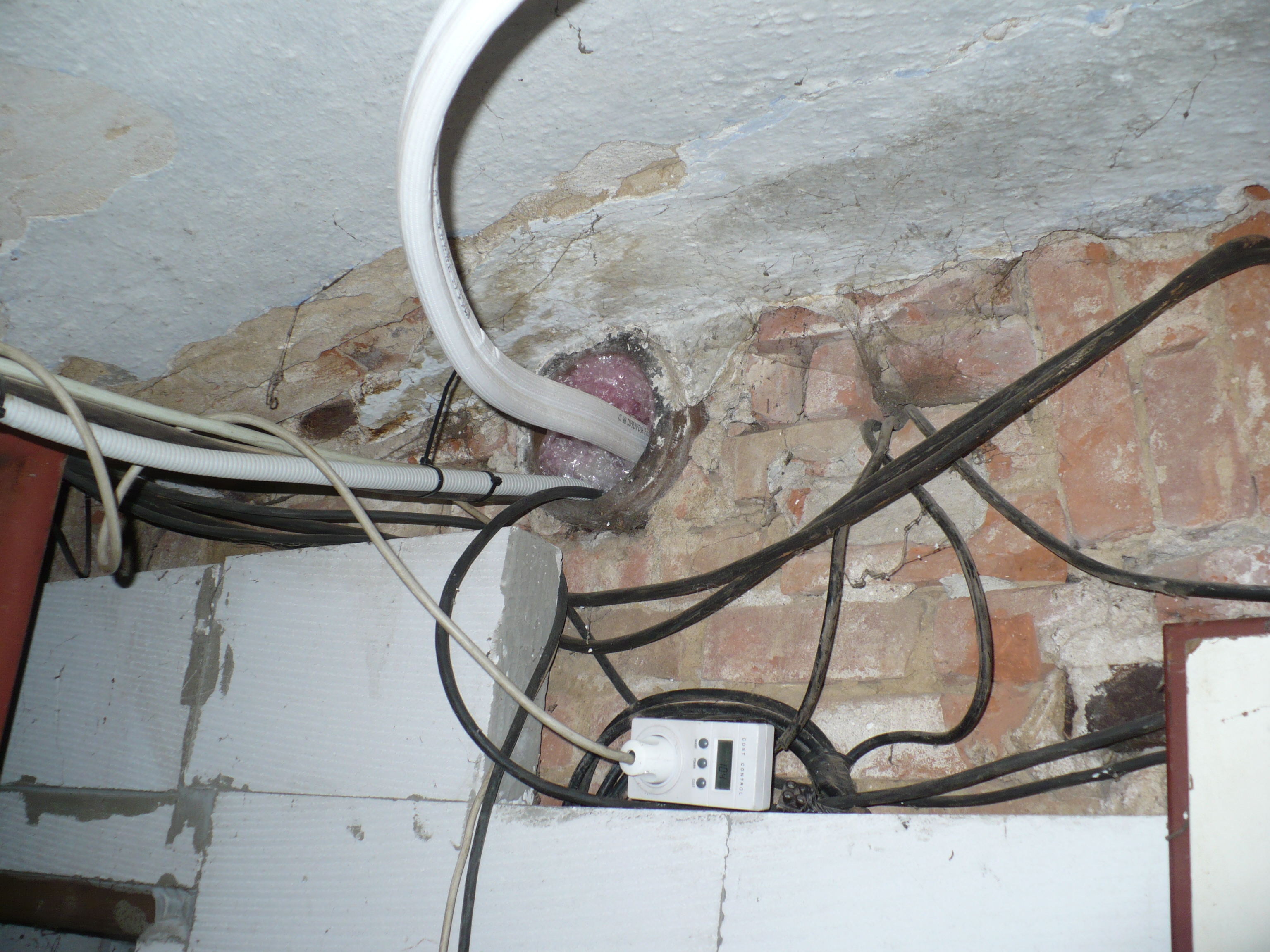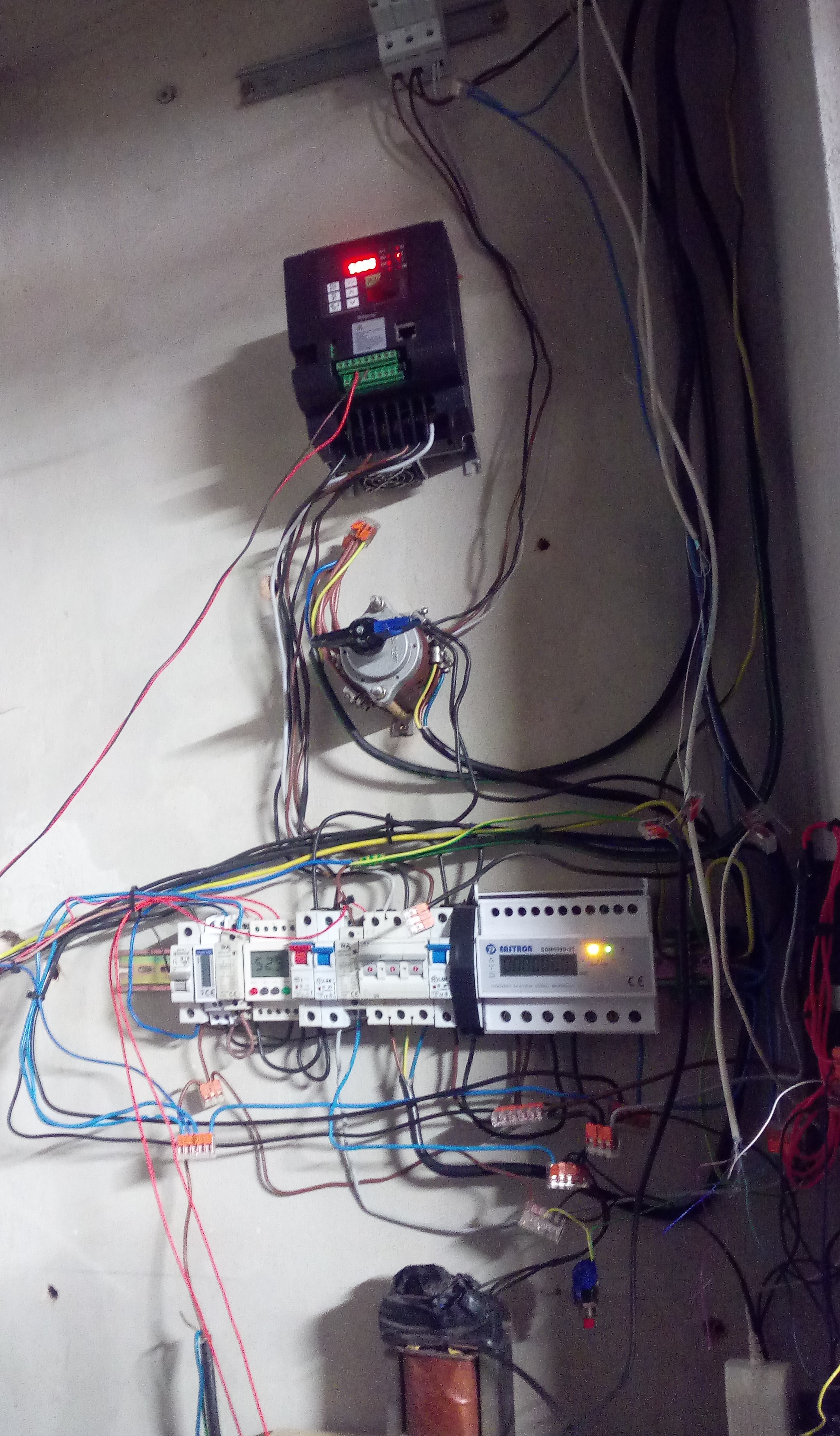 Svazek drátů (vlevo) vede na Severní světovou stranu k vyměňovačům. Odtud se pak proud přelává (2F), přes hlavní jistič (20A) do elektroměru a dále do páteřního rozvodu. Za EM odbočka k 3F měniči nahoře obchvatem kolem 3F přepínače a pak přímo do něj a poté k čerpadlům a šnekovi do sklepení a venkovní zásuvce na dílně pro cirkulu a další 3F divajsy.