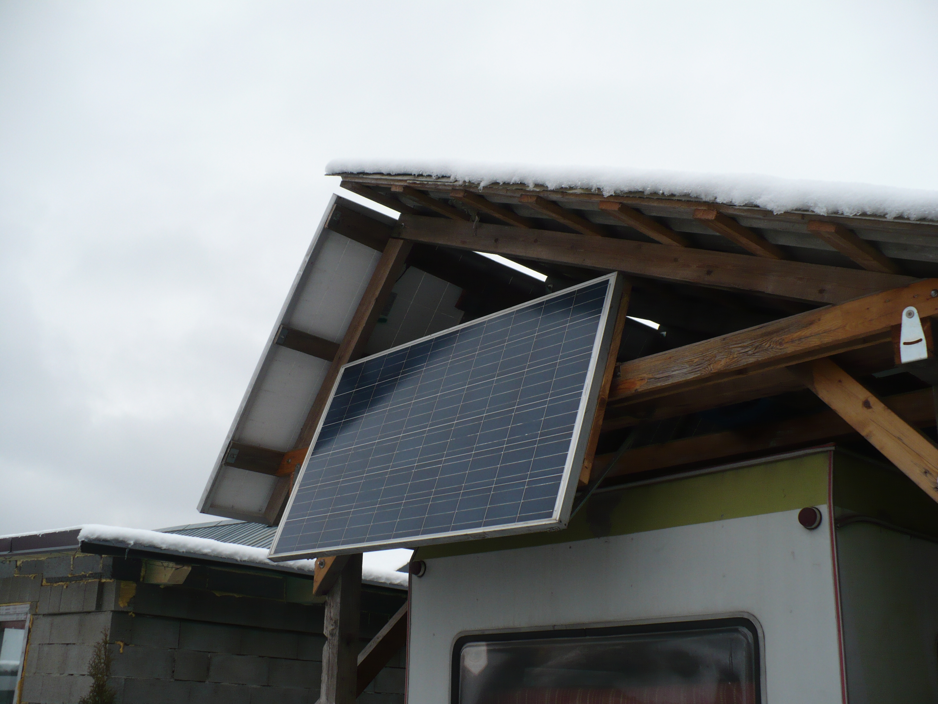 Ten jeden panel mi tu zbyl a tak jsem ho tam dal aby bral nízký výchdní slunce. Je odklápěcí aby se dalo vyjet a konstrukci tvoří upravený rám ze starý postele