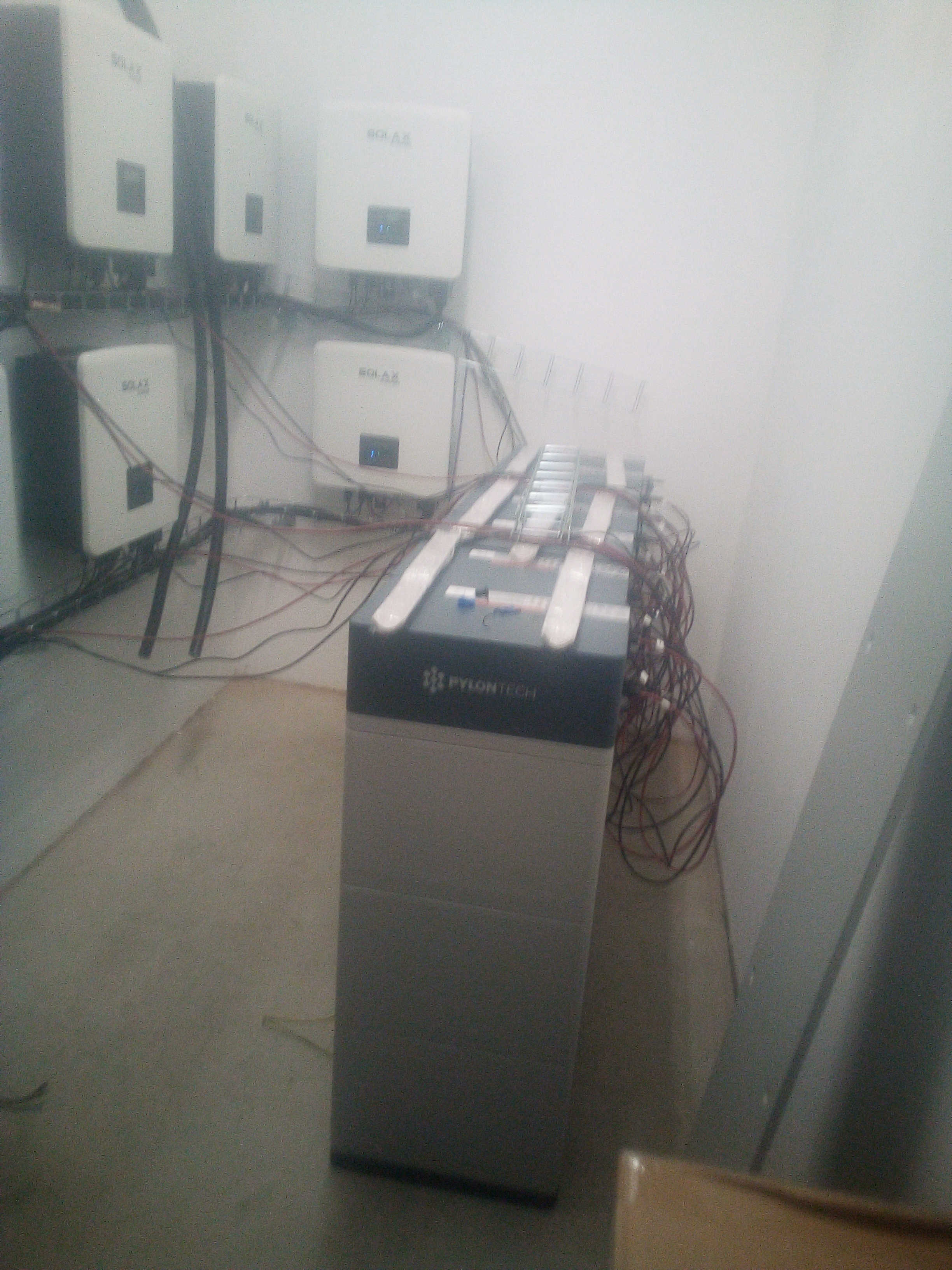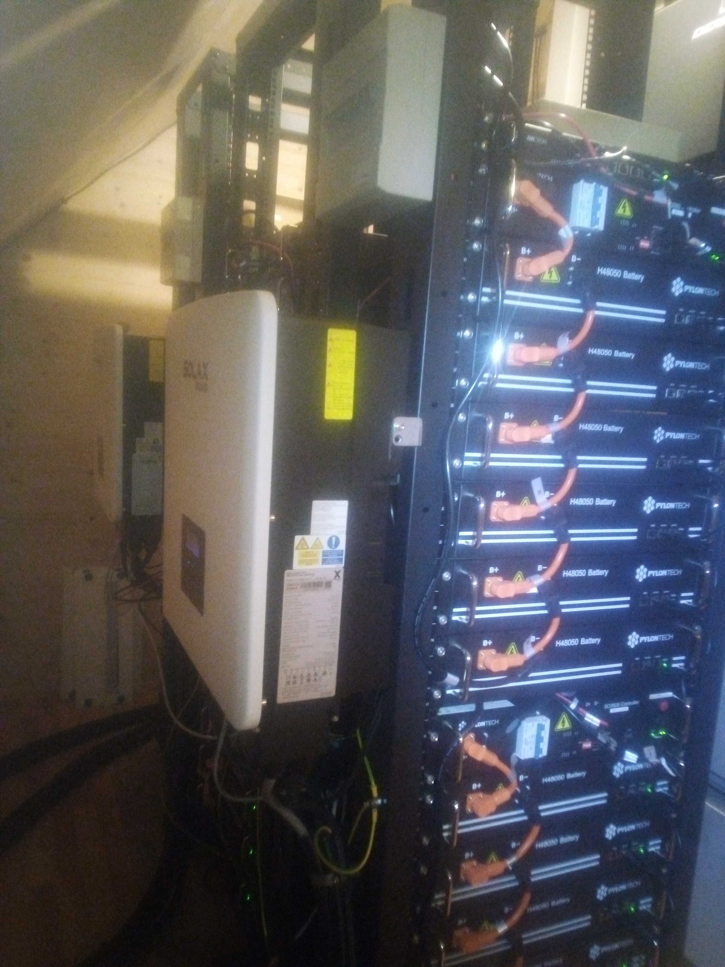 Například: ostrov 32kW v panelech, 2 x Solax 3f. 15kW G4 paraleleně, 36 x Pylontech H48050 = 86,4kWh Pozor na chybu ve firmware BMS Pylontech, musí se aktualizovat.