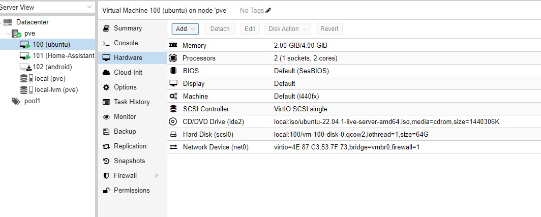 Pozriem si do ktoreho VM chcem disk pripojit (u mna napr ubuntu - VMID 100 a poznacim si, posledny disk ktory tam je je scsi0. Dalsi disk moze byt scsi1,2... alebo virtioXY...