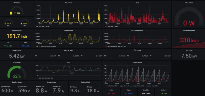 Pokud máš sice hybridní měnič, ale bez povolených přetoků a zároveň s HV baterií, tak je nejlepší najít si nějaký hotový projekt na Rasberry, který umí s měničem komunikovat, vyčítat jeho provozní hodnoty a podle toho třeba vyrábět grafy v Grafaně, spínat mechanické stykače či SSR relé, atd.