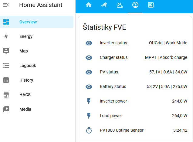 2x MUST PH1800 5.5kW, 9kWp V+J+Z, 600 Ah LiFePO4 s BMS JBD 200A, SW: Home Assistant na Synology DS923+ ku tomu ESPHome, Tasmota, MariaDB, InfluxDB, Telegraf, Grafana, Zigbee2MQTT..., HW: ESPlan (ESP32 + LAN 8720 + RS485). Nejaké moje projekty: MUST-ESPhome, ELTEK Flatpack2 ESPhome, ESP32-EMON, PZEM-017@WiFi, diyBMS-CurrentShunt-ESPhome , BMS UART-TS485 adaptér